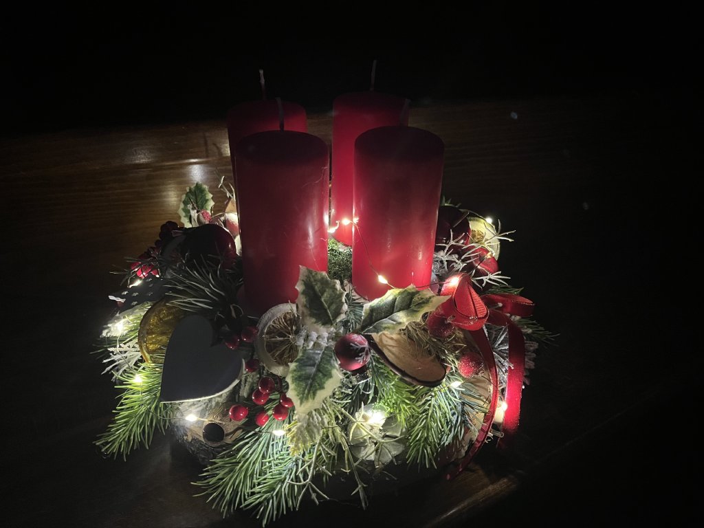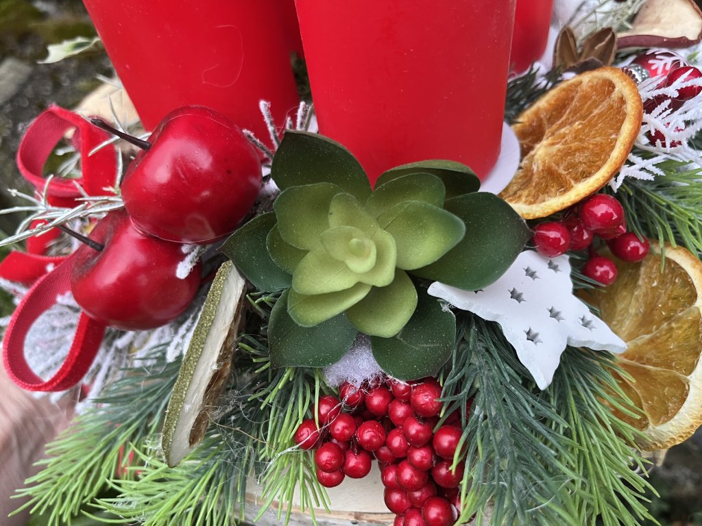 Svíčky jsou umístěny na kovových bodcích a obklopeny bohatým vánočním zdobením – umělým chvojím, sušenými jablky, pomeranči a limetkou, dřevěným srdíčkem, sukulenty, plody eukalyptu, červenými bobulemi, malými umělými jablíčky a doplněny sametovou červenou stuhou. Celek podtrhují LED světýlka v teplé bílé barvě, která dodávají svícnu kouzelný třpyt.