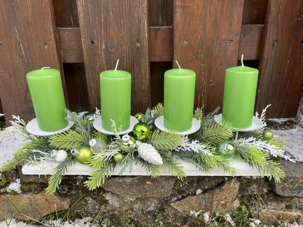 Adventní svícen na stůl se zelenými svíčkami – zeleno-bílý