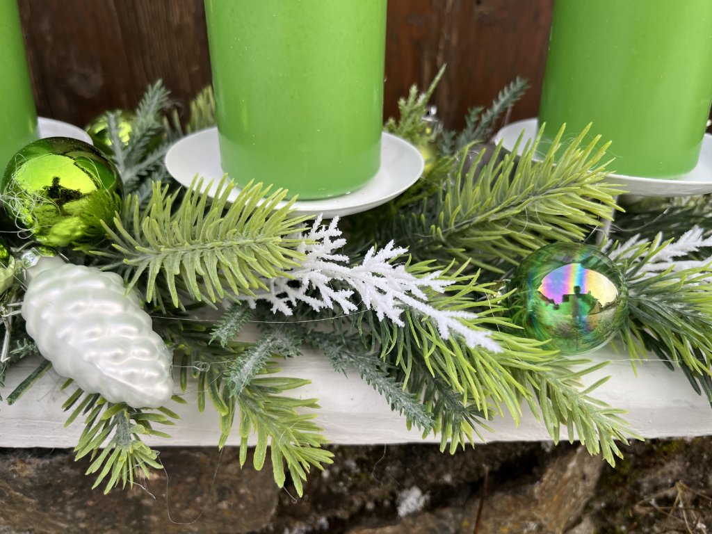 Stylový adventní svícen na stůl v elegantní zeleno-bílé kombinaci, který přinese do vašeho domova klidnou vánoční atmosféru. Je bohatě zdobený umělými větvičkami s glitry, skleněnými ozdobami v různých odstínech zelené. Díky detailnímu zpracování působí slavnostně a stane se krásným doplňkem vaší adventní výzdoby.