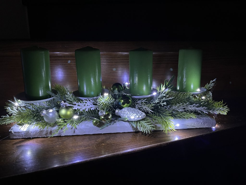 Adventní svícen na stůl se zelenými svíčkami a LED světýlky