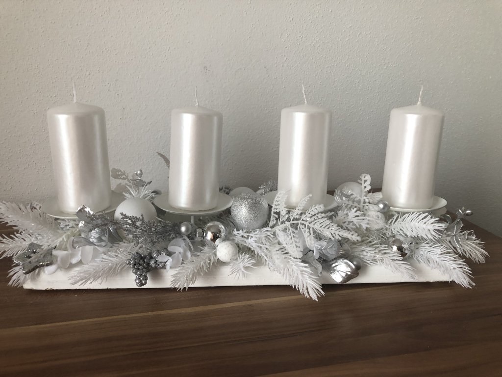 Adventní svíčky jsou laděny do jemné perleťově bílé barvy, což přispívá k čistému a klidnému vzhledu svícnu. Bílá barva navíc vytváří krásný kontrast se stříbrným podkladem, což dodává svícnu nádech elegance. -