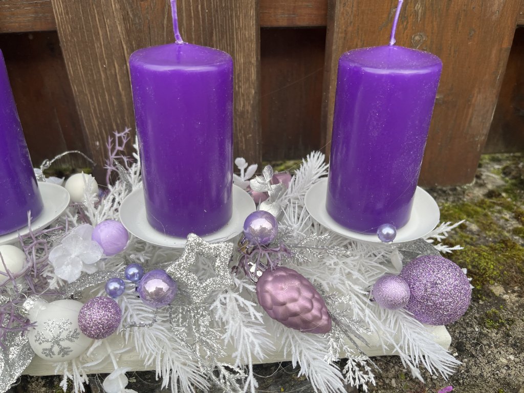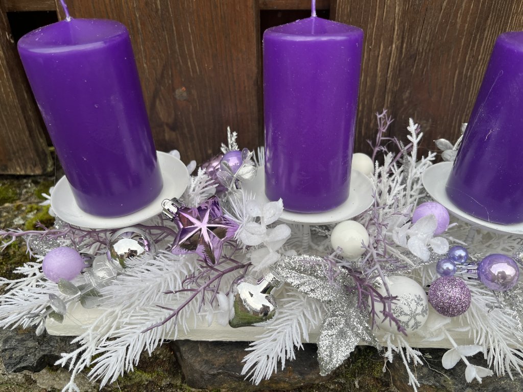Elegantní adventní svícen s fialovými svíčkami a LED světýlky vyniká svým moderním a zároveň slavnostním vzhledem. Umístěn je na podlouhlém dřevěném podnosu v bílé barvě, který doplňuje jemné zimní zdobení. Celý svícen působí stylově a decentně, ideální pro adventní období i vánoční výzdobu.