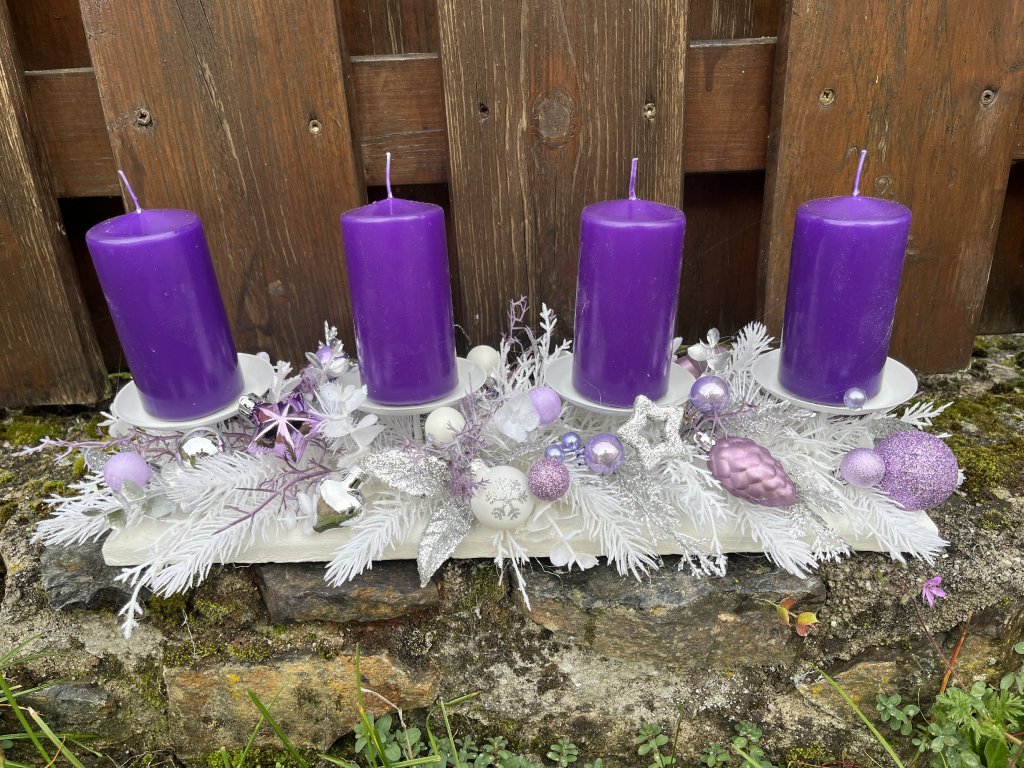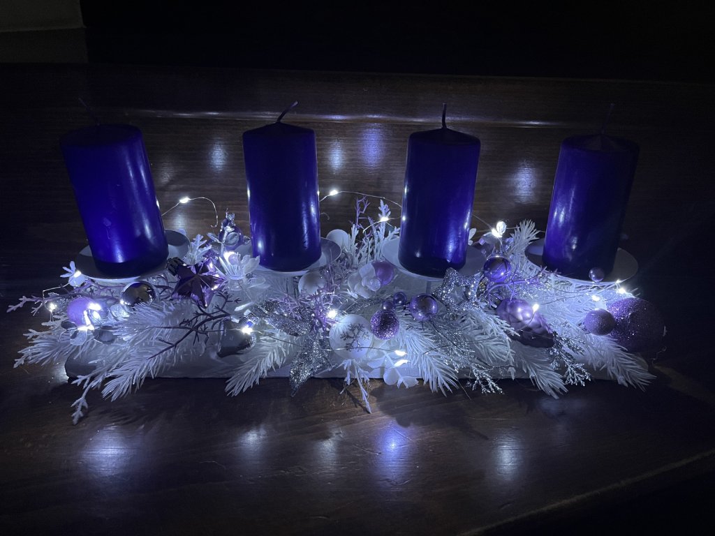 adventní svícen, rovný svícen s LED světýlky, fialové svíčky, vánoční dekorace, adventní výzdoba, svícen na stůl, svícen s časovačem, české svíčky, vánoční svícen s LED osvětlením, dekorace s glitry