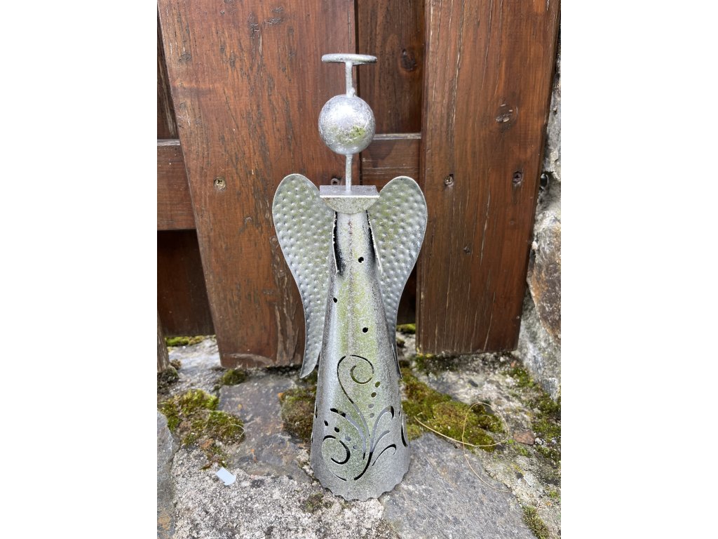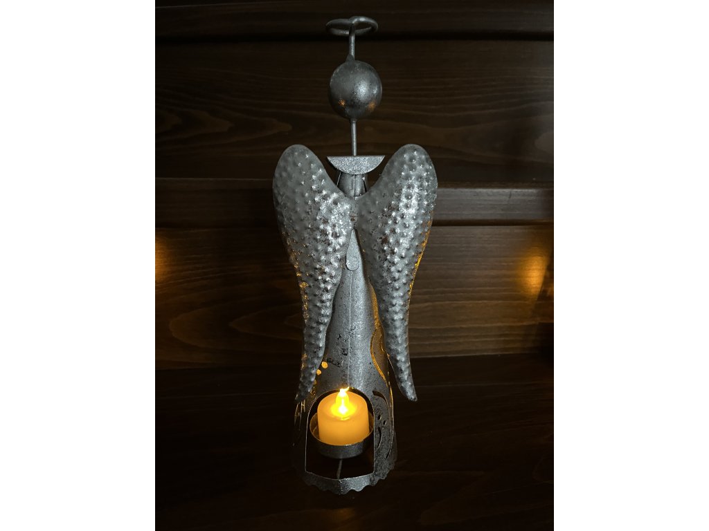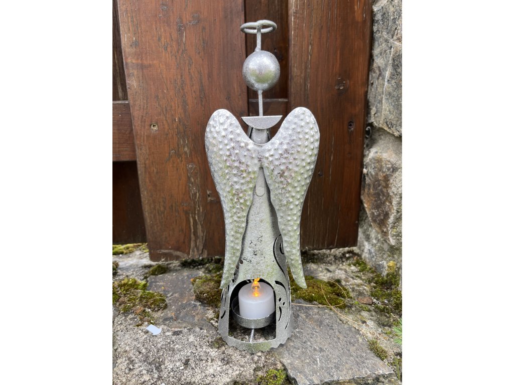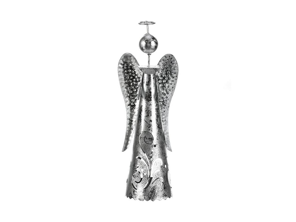 Dekorace Kovový anděl s LED svíčkou stříbrný 27 cm