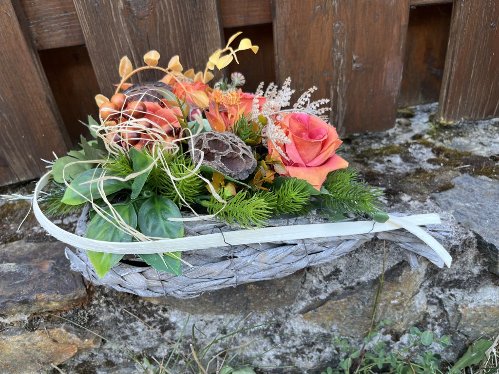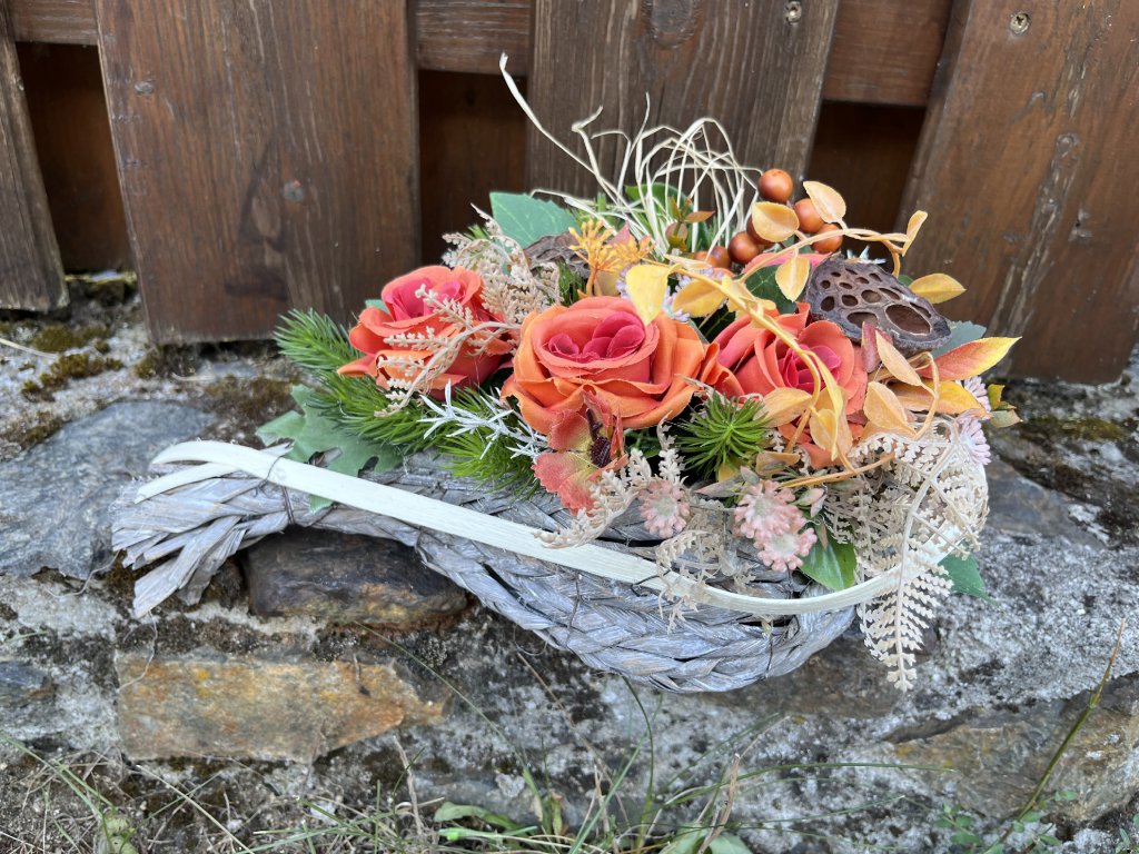 dekorace na Dušičky, srdce s růžemi, proutěná dušičková dekorace, hřbitovní dekorace srdce, podzimní dekorace na hrob, pietní aranžmá