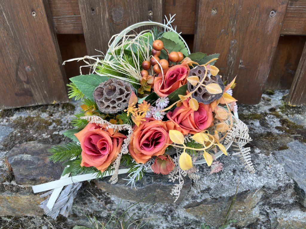 Tato elegantní dušičková dekorace ve tvaru srdce je vyrobena z šedého proutí a zdobena tak, aby působila důstojně a přirozeně. Srdce je aranžováno oranžovými růžemi, umělou zelení, hnědým kapradím, hnědými květy, lotosem a lýkem. Celek doplňuje jemný bělený ratan po obvodu, který dodává dekoraci lehkost a harmonii.