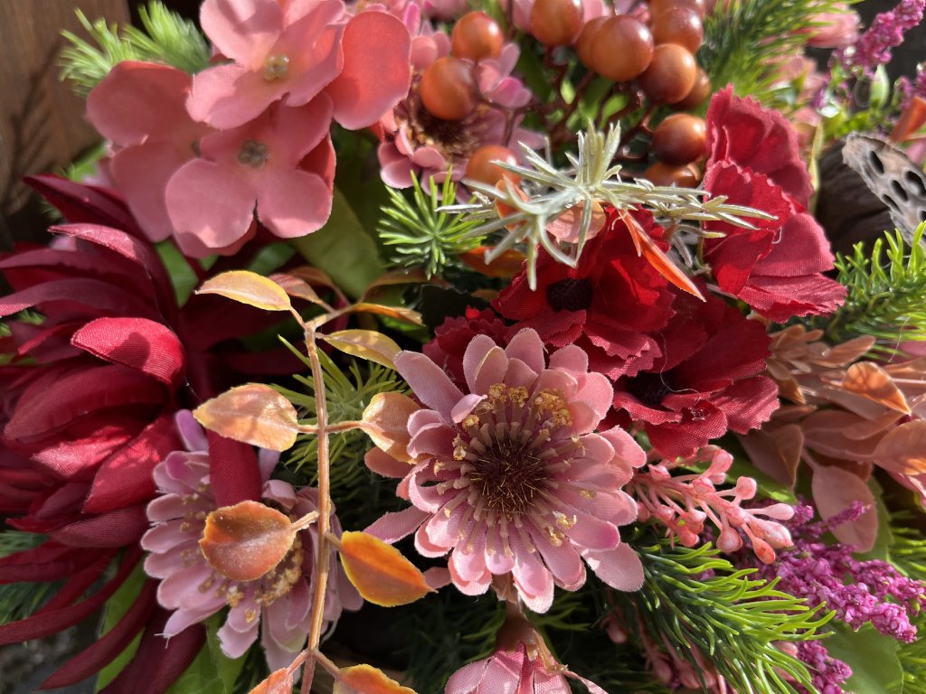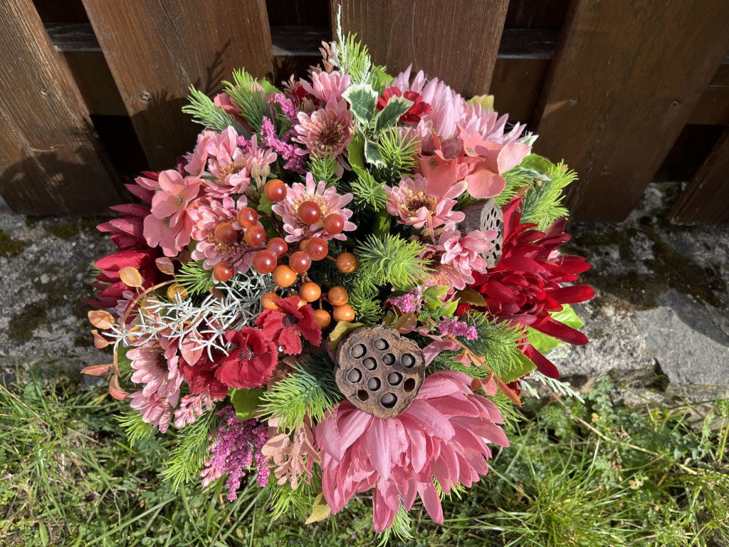Elegantní dekorace na Dušičky v kulatém obalu je vkusným a trvanlivým způsobem, jak uctít památku vašich blízkých. Krásný proutěný kulatý truhlík je bohatě nazdoben umělým chvojím, látkovými chryzantémami v bordó a starorůžové barvě, doplněnými o hortenzii, suché plody, hnědé bobule, větvičky a jemný vřes.