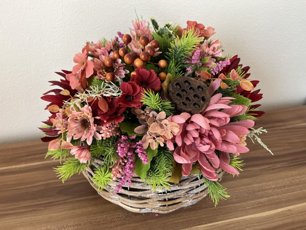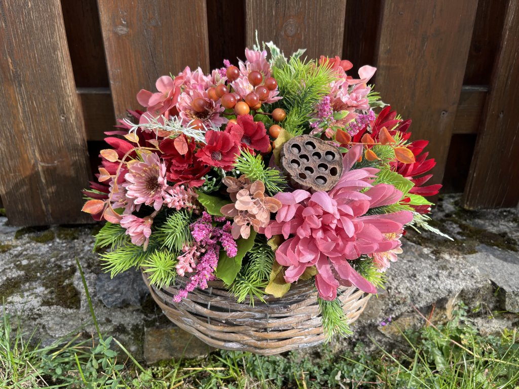 dekorace na Dušičky, podzimní dekorace, dekorace na hrob, chryzantémy, umělé chvojí, proutěný truhlík, dušičkové aranžmá, bordó květiny, starorůžové květiny