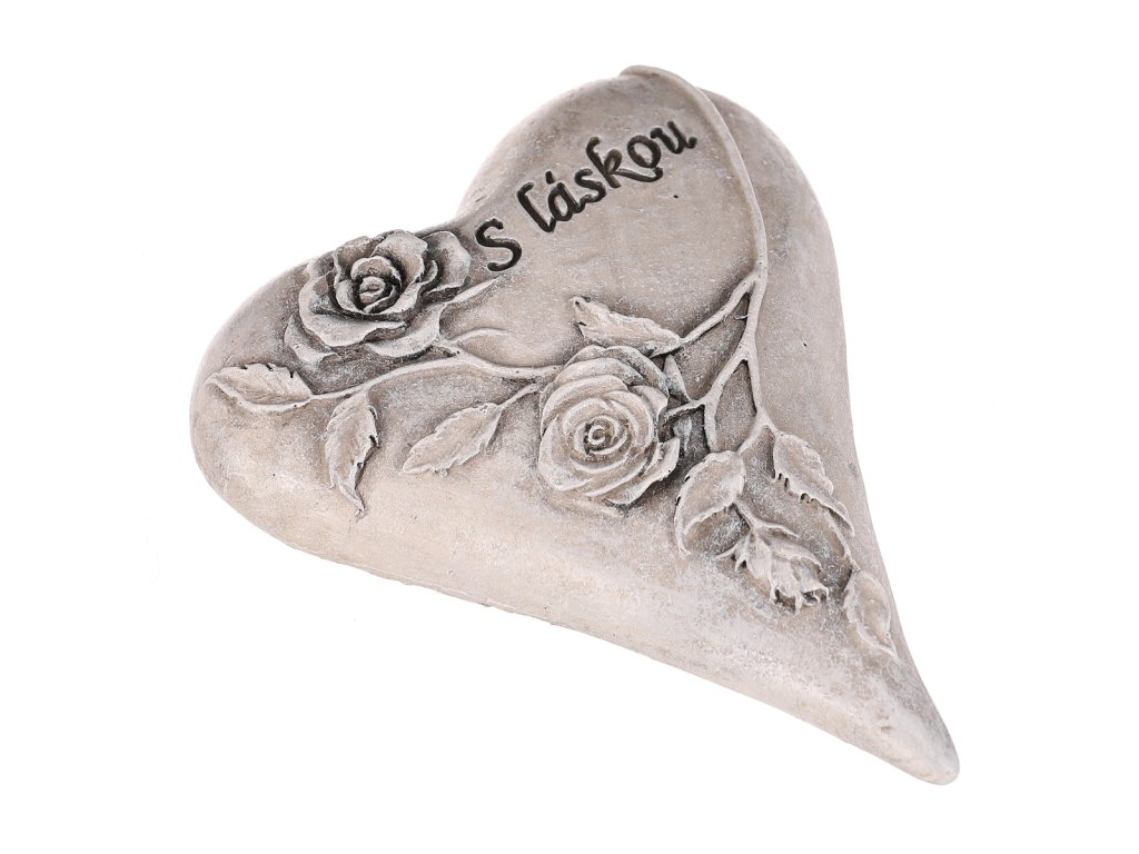 Decentní pietní dekorace na hrob ve tvaru srdce je symbolem úcty, vzpomínky a lásky. Šedé srdce na položení zdobí jemný reliéf růže a nápis „S láskou“, který vyjadřuje city k blízkým zesnulým.