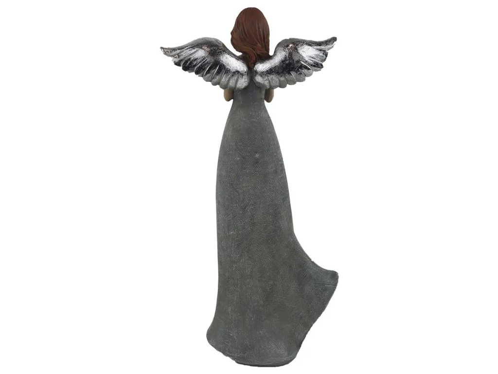 Dekorace šedý anděl se stříbrným srdcem – elegantní soška 30 cm