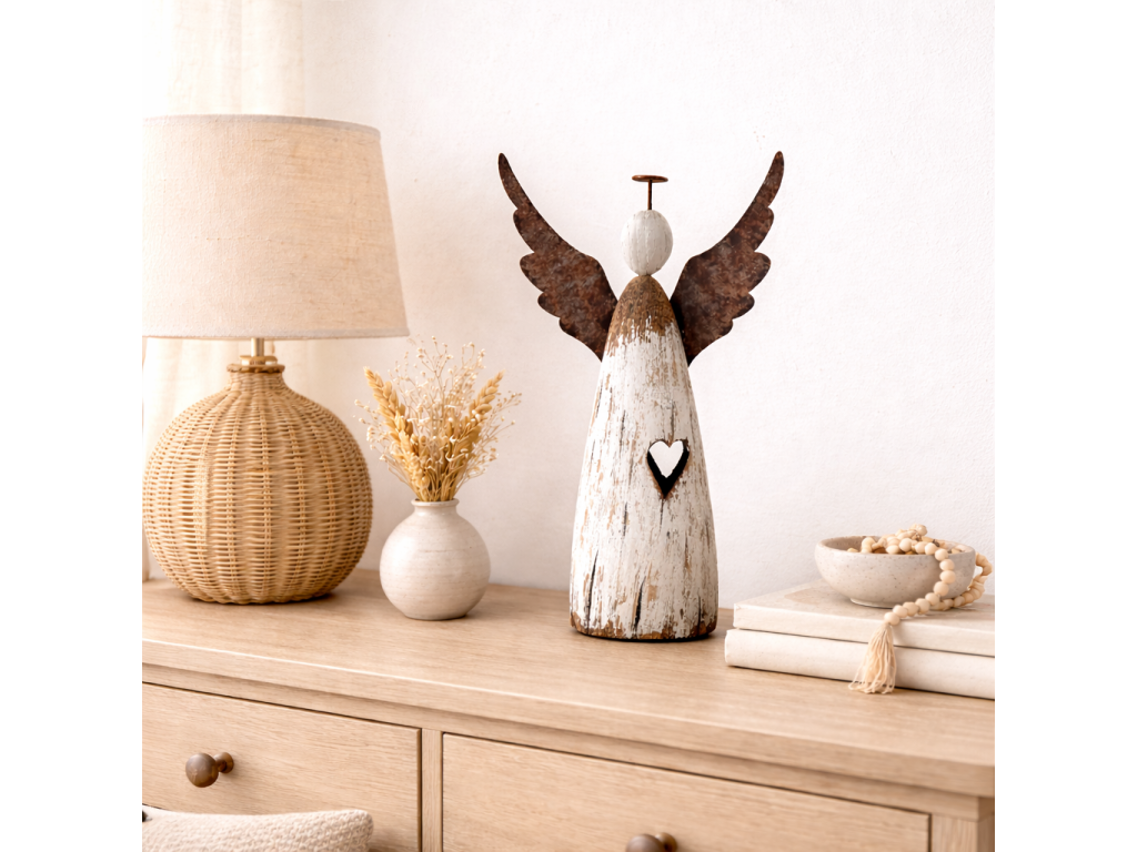 Závěrem: Dřevěný anděl s kovovými křídly je víc než jen ozdoba. Je to tichý společník, který vašemu domovu dodá charakter a připomene důležitost vnitřního klidu.