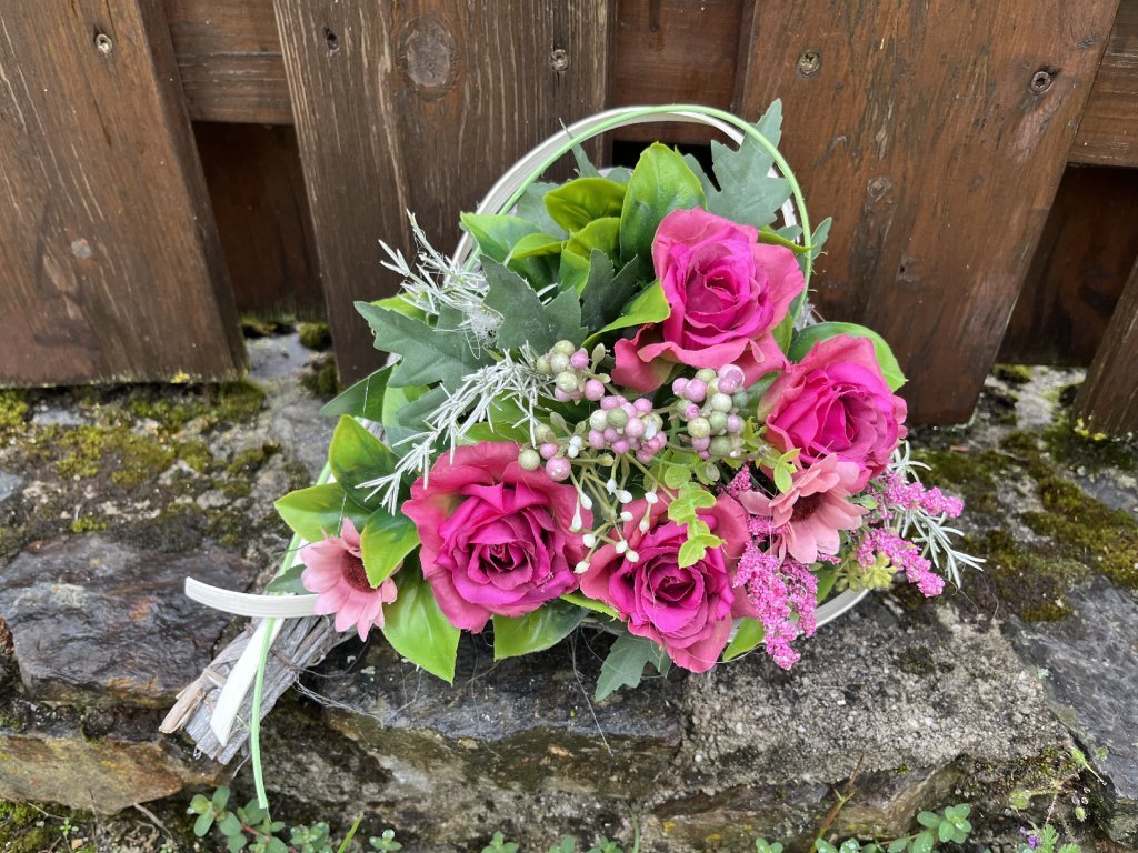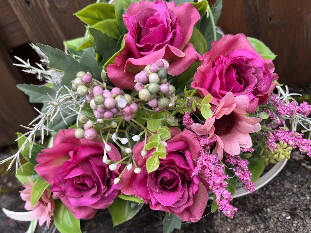 Toto srdce na hrob s tmavě růžovými růžemi a umělou zelení je ideální volbou pro ty, kteří hledají odolné a estetické Dušičkové dekorace.