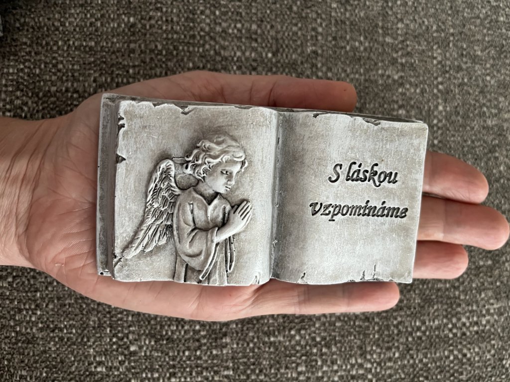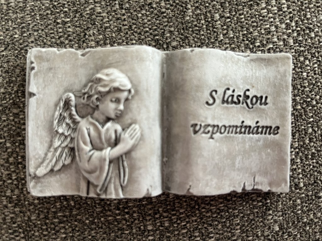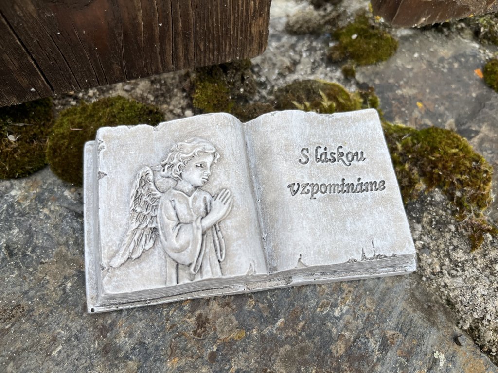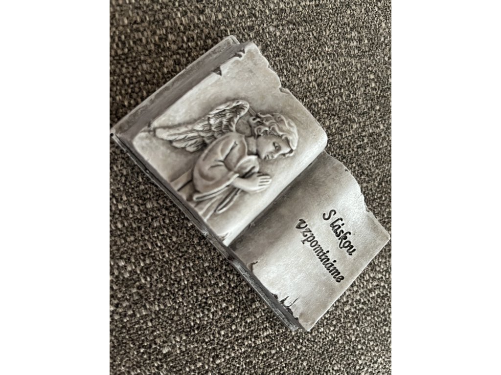 Kompaktní, ale výrazná dekorace v podobě otevřené knihy, která symbolizuje vzpomínky, příběhy a věčnou lásku. Nápis „S láskou vzpomínáme“ vyjadřuje vše podstatné s jemnou pietou.