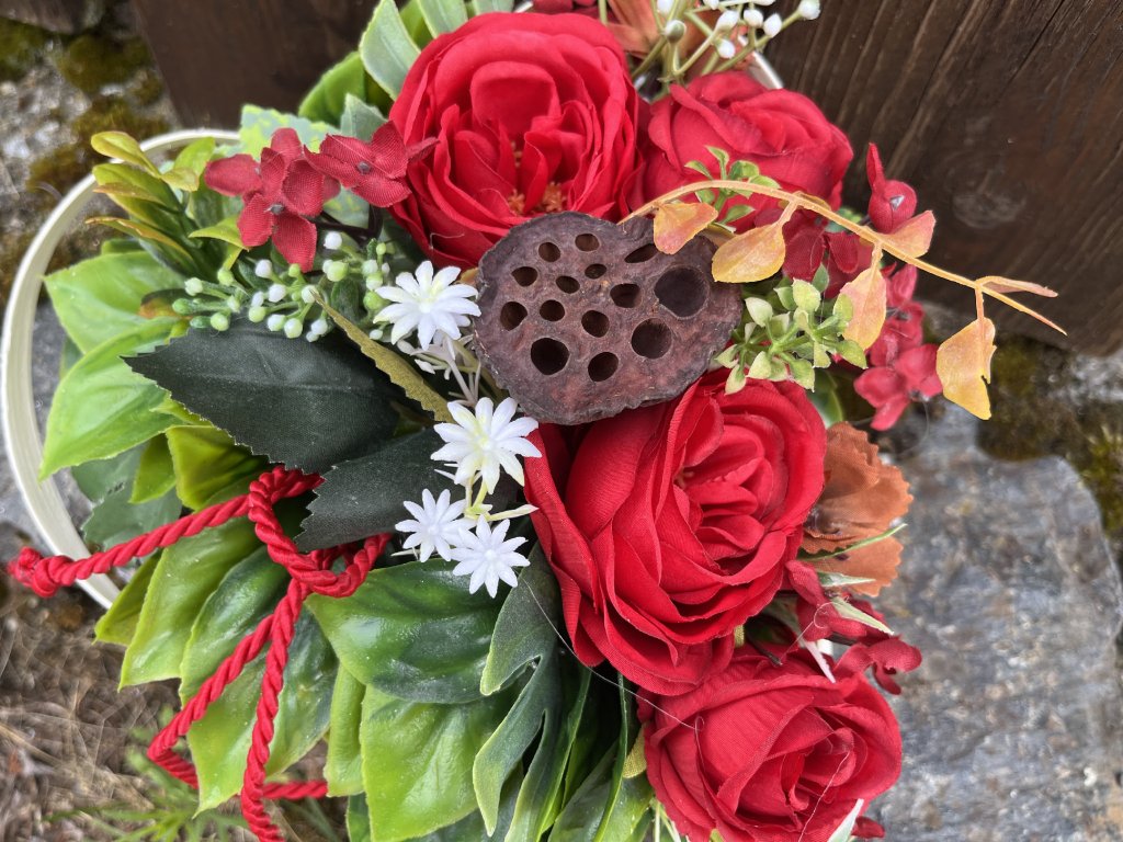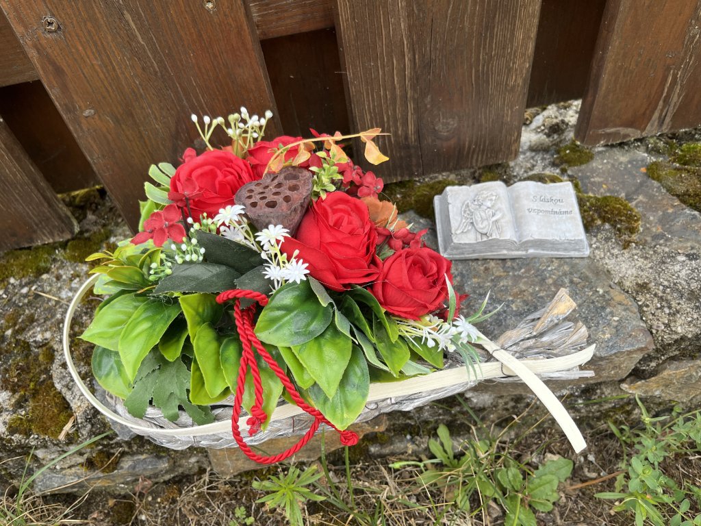Elegantní dekorace ve tvaru srdce, vyrobená z přírodního proutí a bohatě ozdobená kvalitními umělými květinami. Je navržena tak, aby byla estetická i praktická – vydrží po celé dušičkové období i mnohem déle.
