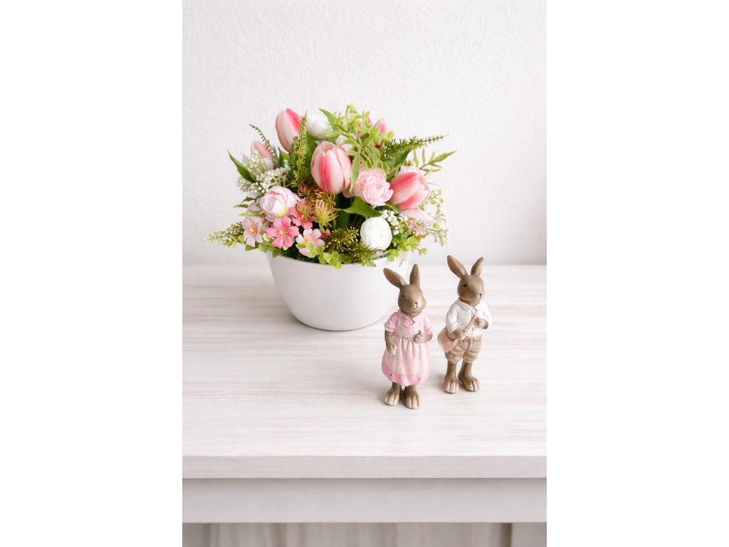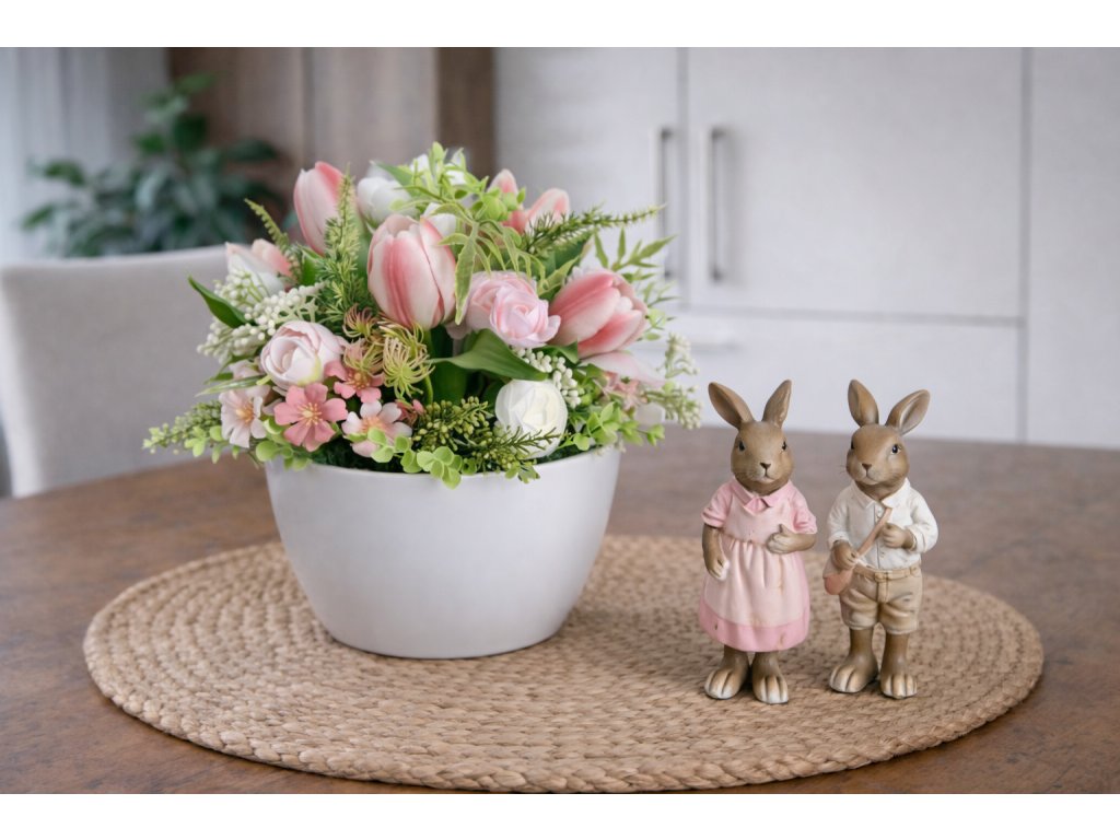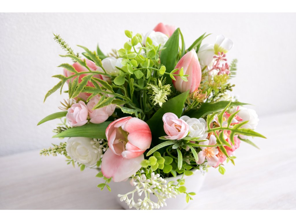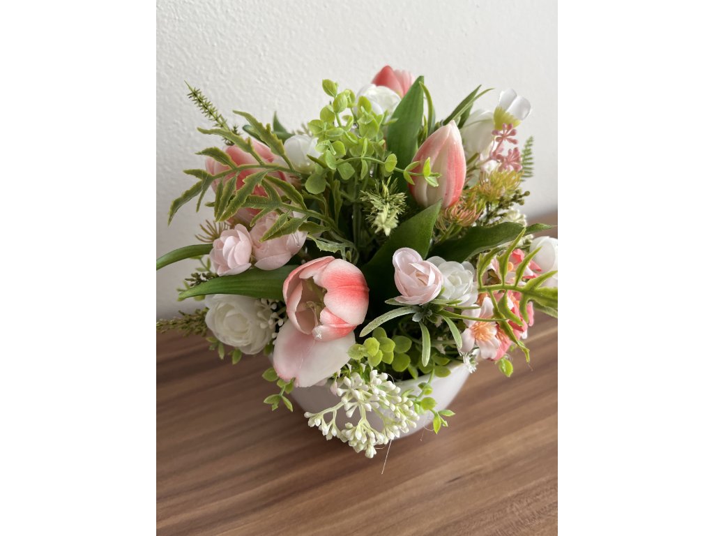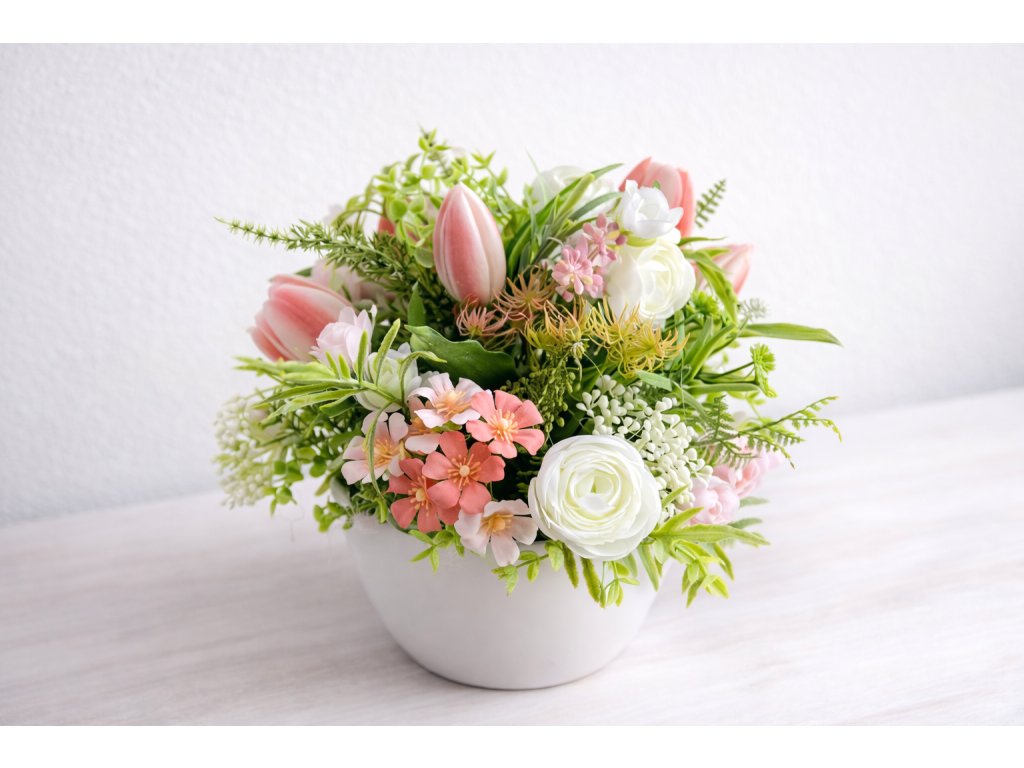 Jemná květinová jarní dekorace do bytu, ideální na stůl, komodu nebo parapet. Aranžmá je laděno do něžných odstínů růžové a bílé, které prostoru dodají svěžest a klidnou jarní atmosféru. Vše je ručně aranžované do elegantního keramického obalu.