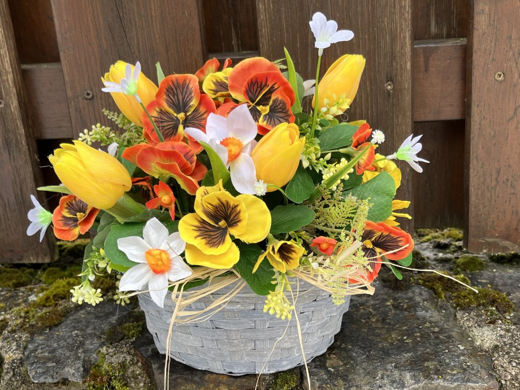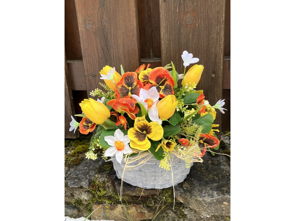 Šedý bambusový obal je zatížený pro lepší stabilitu a ručně zdobený bohatou kombinací umělých květin. Dominantou jsou oranžové a žluté macešky, které doplňují žluté tulipány, bílé narcisky, drobné žluté květy a svěží zeleň. Celek je ozvláštněn přírodním lýkem, které dekoraci dodává přirozený a harmonický vzhled.