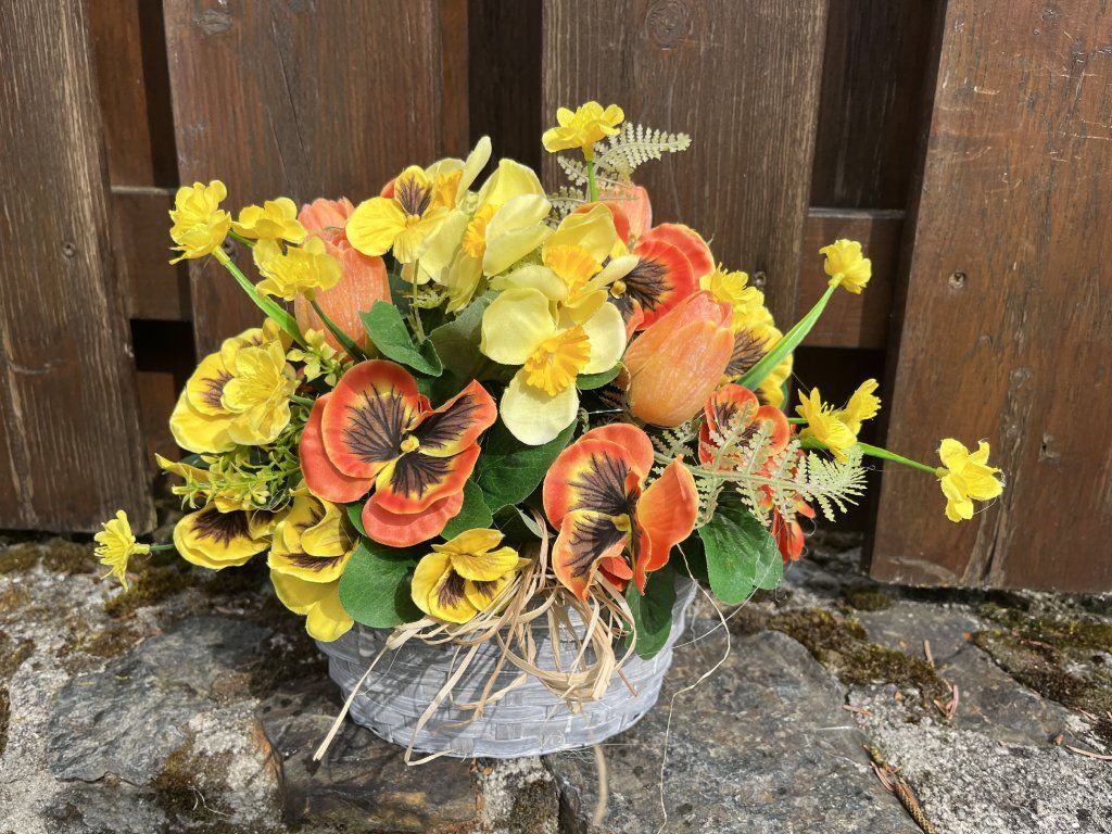 Jarní dekorace na hrob s oranžovými maceškami Malechas: Hřejivá vzpomínka zalitá sluncem