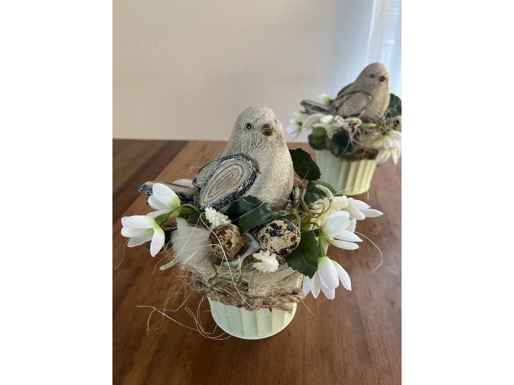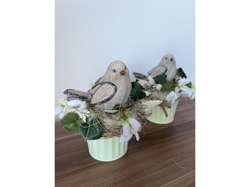 1 ks plechový květináč s dekoračními rostlinami, 2 křepelčí vajíčka, 1 ptáček z polyresinu