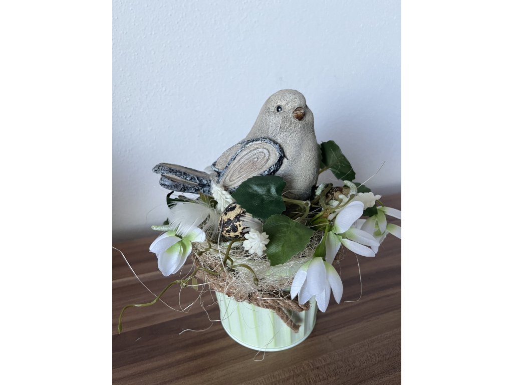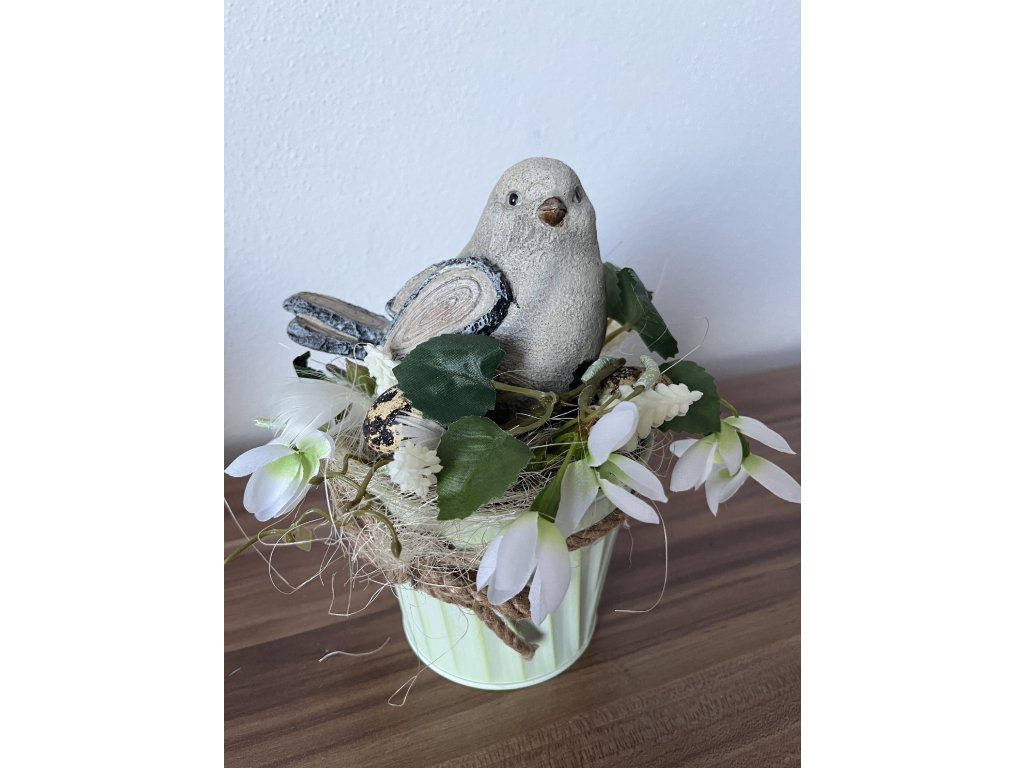 Vytvořte si doma příjemnou jarní atmosféru pomocí této originální jarní dekorace s ptáčkem, která zaujme detailním zpracováním a jemnými přírodními prvky. Dekorace je tvořena roztomilým ptáčkem z polyresinu, umístěným v plechovém květináči se sisalem. Celek je bohatě doplněn o umělou větvičku břízy, umělé sněženky, bílý modřenec, jemná peříčka a křepelčí vajíčka, které podtrhují jarní a velikonoční charakter dekorace.