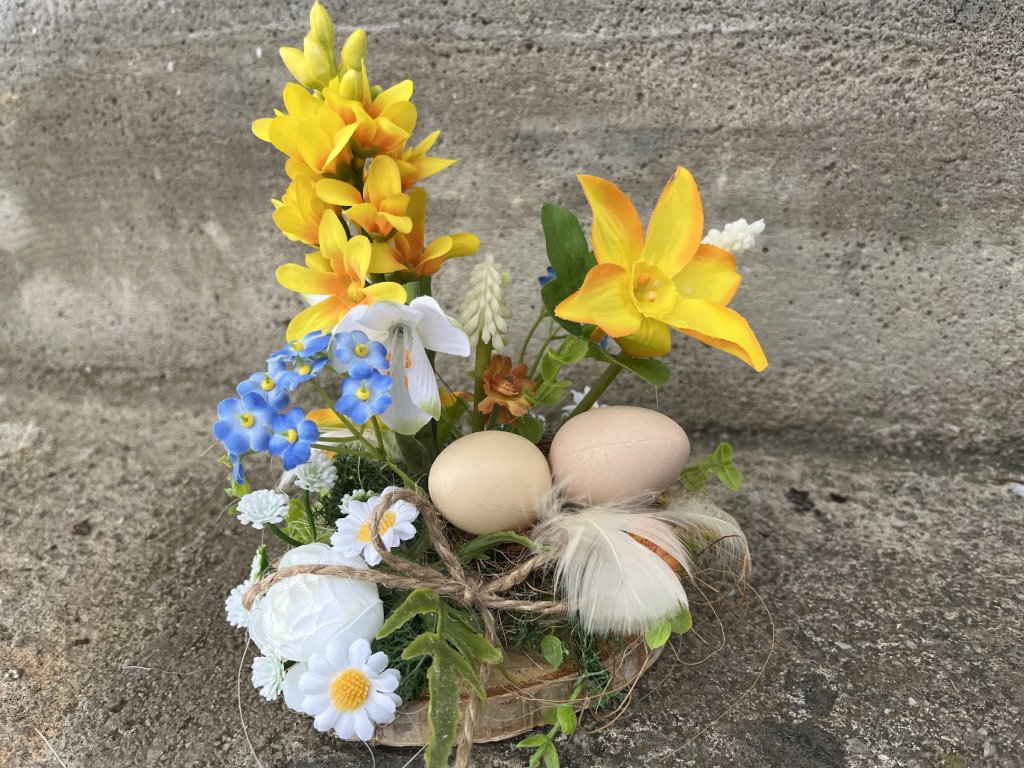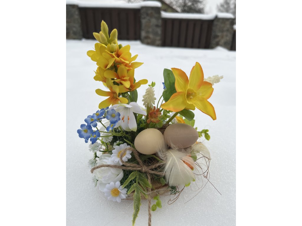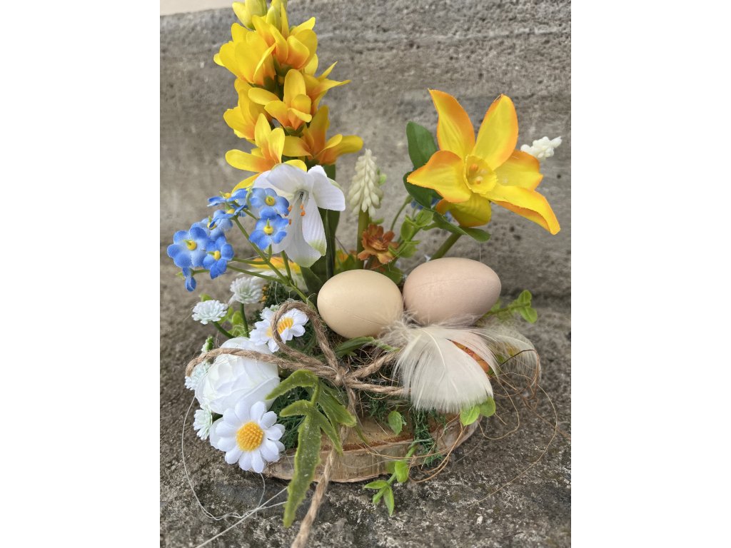Jarní květinová dekorace na dřevěné kulatině je zdobená žlutým hyacintem, žlutými narciskami, pomněnkami, bledulemi, bílým modřencem, květy heřmánku, zelení, stabilizovaným meche, sisalem, plastovými vajíčky, peříčky.