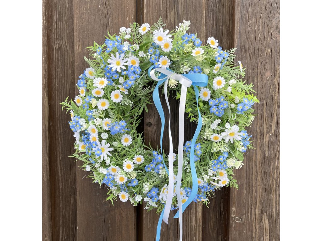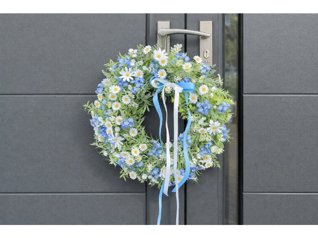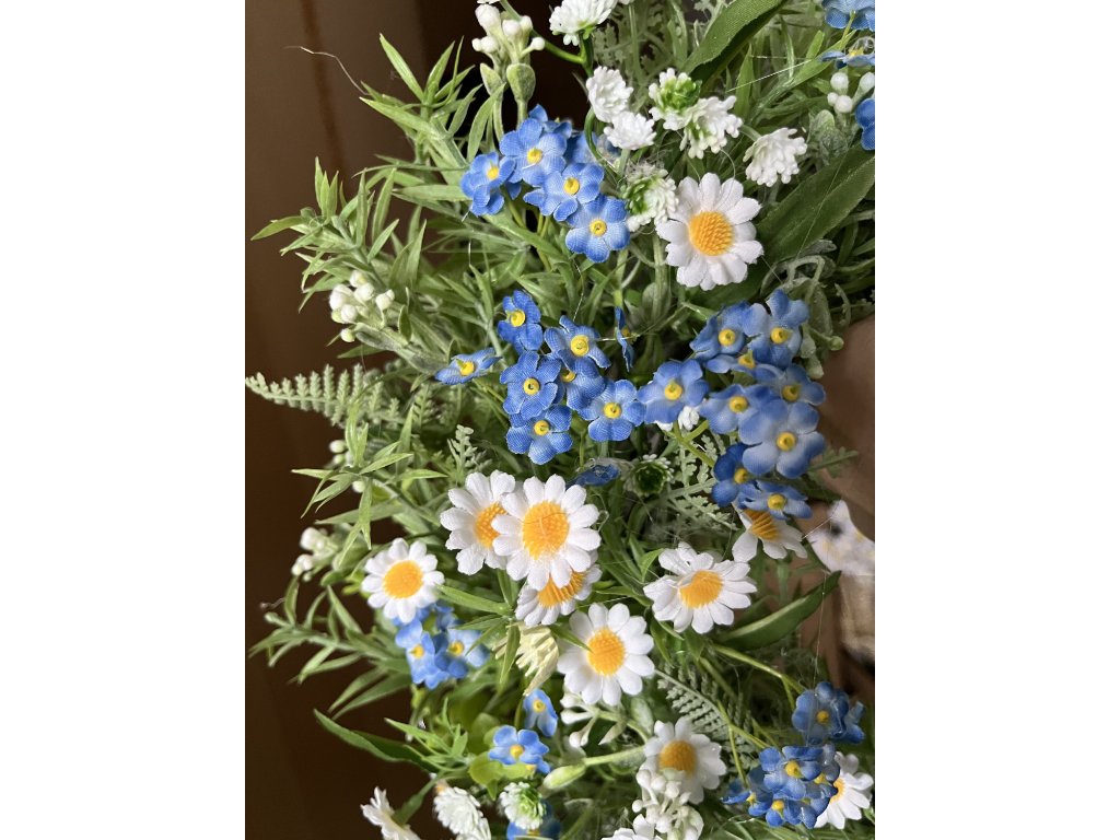 Jarní věnec na dveře s pomněnkami je ručně vyráběná dekorace, která vnese do vašeho domova svěžest a lehkost jara. Základem je kvalitní ratanový věnec, bohatě zdobený umělou zelení, kapradím, heřmánkem, kopretinami a krásnými pomněnkami, které jsou jako živé. Celkový vzhled doplňují jemné stuhy v modré a bílé barvě, ideální pro jarní a velikonoční období.