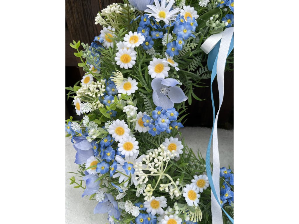 Symbolika: Pomněnka (v angličtině "forget-me-not") nese poselství vzpomínek a upřímného citu, což z věnce činí milé přivítání pro každého hosta.
