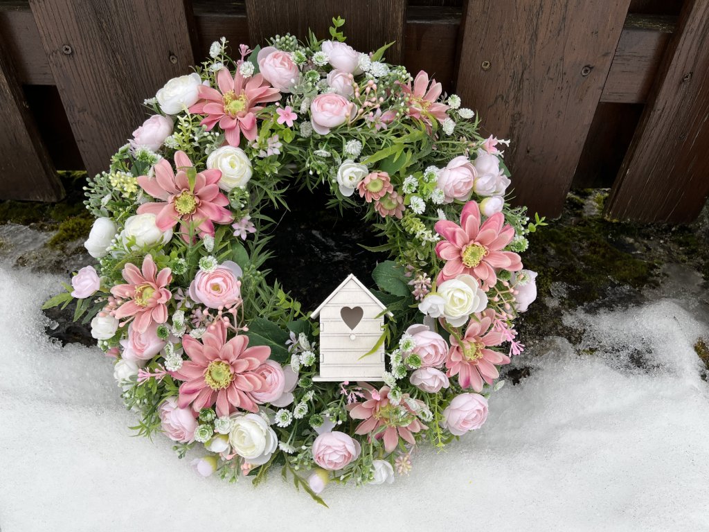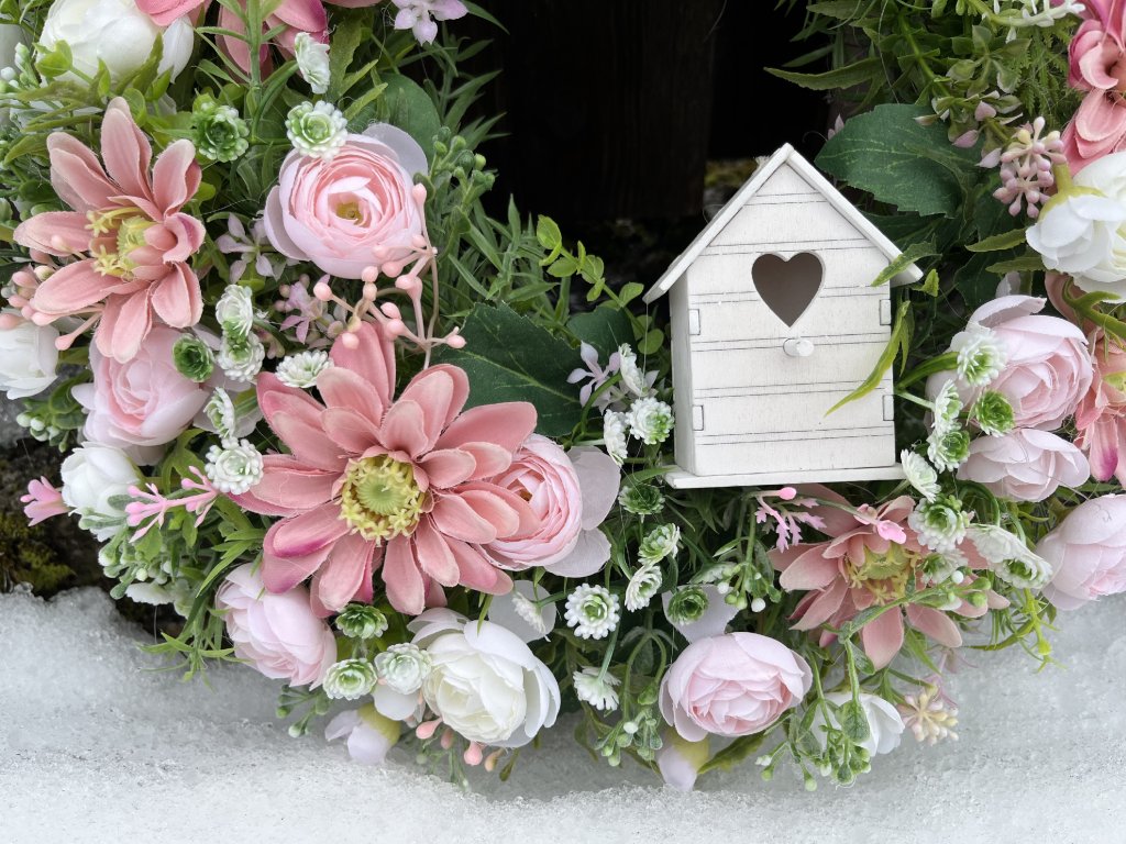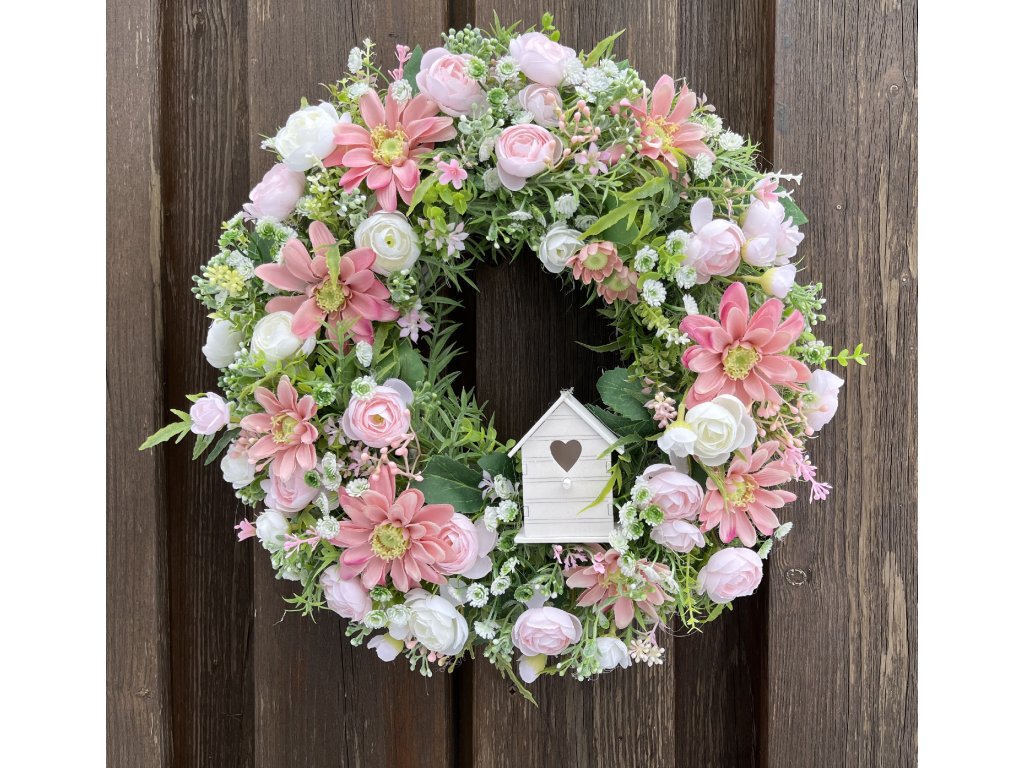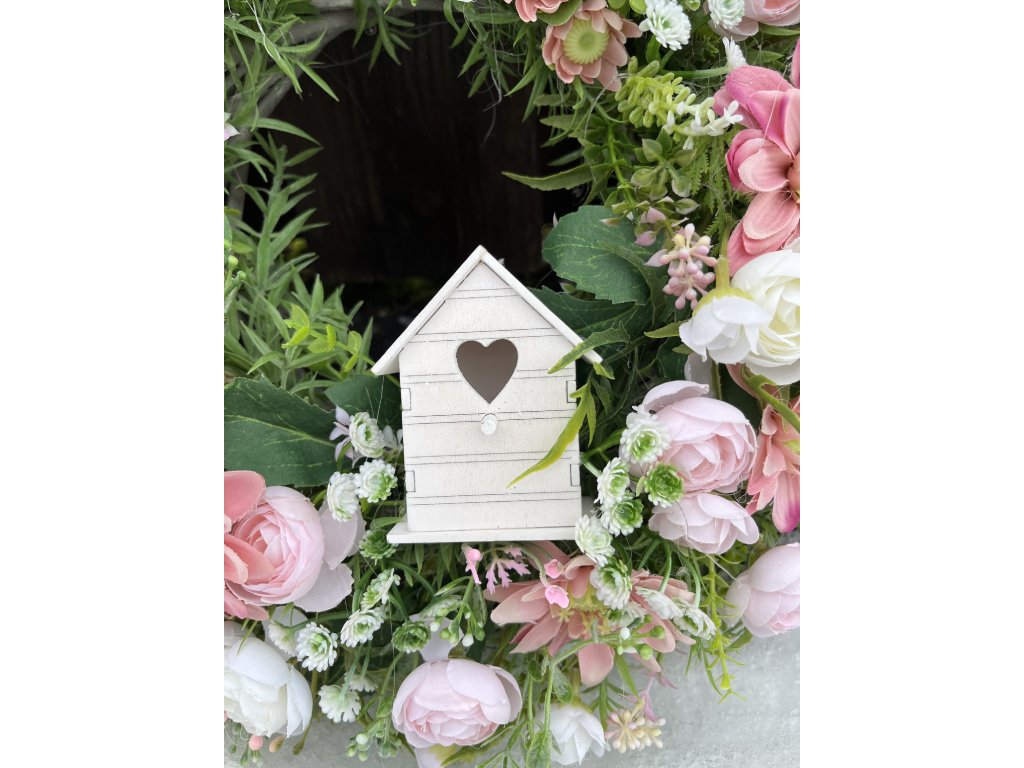Jarní věnec na dveře růžový s budkou 38 cm