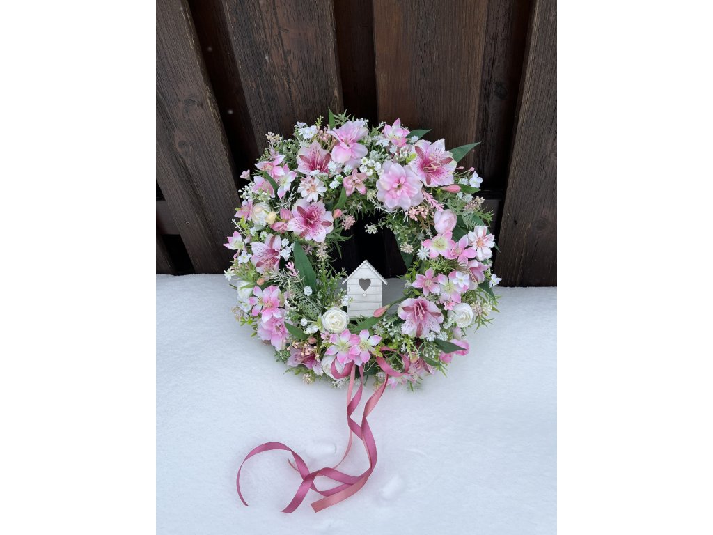 Jemný a romantický jarní věnec na dveře v růžových tónech je krásnou dekorací, která vnese do vašeho domova svěžest a jarní pohodu. Základ tvoří ratanový věnec, který je ručně zdobený zelení, umělým eukalyptem, drobnými květy a výraznými květy alstromerie v kombinaci bílé a růžové barvy. Dominantním prvkem je dřevěná bílá dekorační budka se srdíčkem, která dodává věnci něžný a útulný charakter. Ve věnci jsou růžové stuhy.