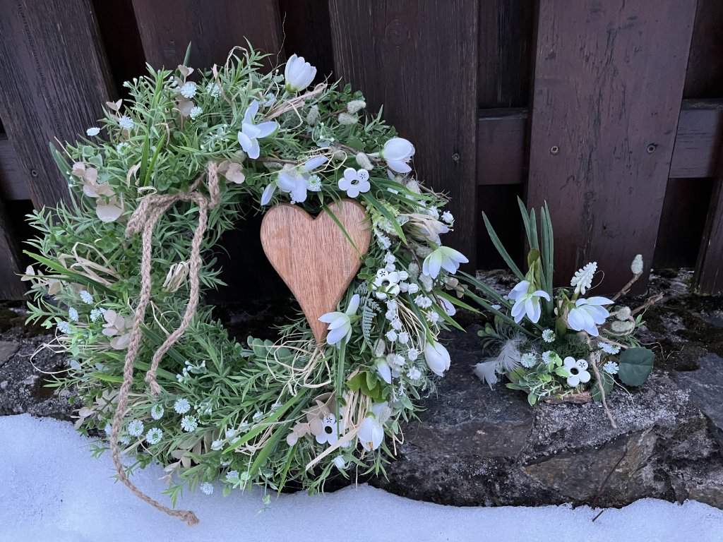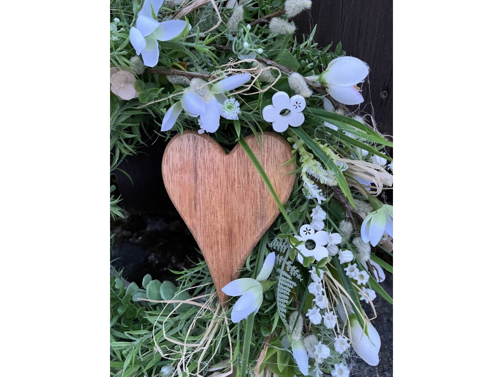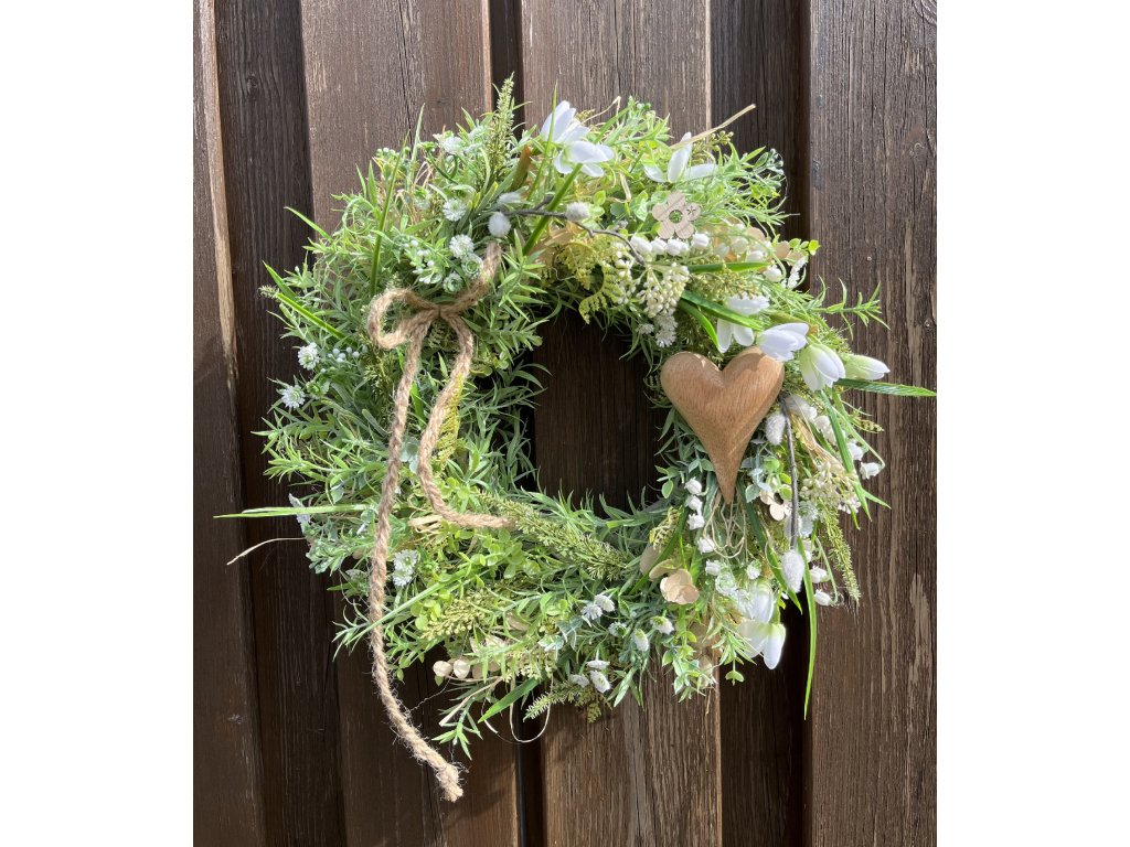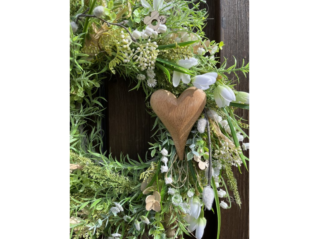 Věnec je hustě zdoben zelení, umělým eukalyptem, kapradím, sněženkami, bílými krokusy, umělými kočičkami, konvalinkami a dřevěnými květy. Dominantním prvkem je krásné dřevěné srdce, doplněné přírodním lýkem a šňůrkou. Celek působí jemně, svěže a velmi přirozeně.