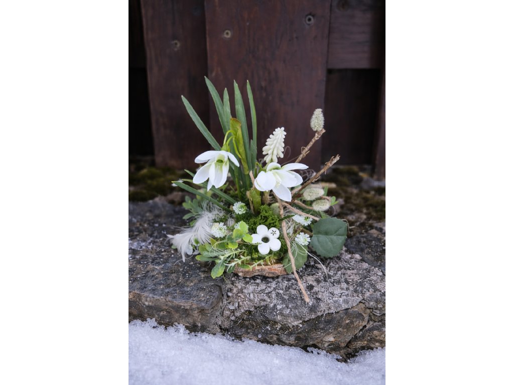 Součástí setu je také jarní dekorace na stůl umístěná na dřevěném plátu. Ta je zdobená umělými sněženkami, bílým modřencem, umělými kočičkami, sisalem, zelení, stabilizovaným mechem a dřevěnými květinami. Dekorace krásně doplní věnec a vytvoří sladěnou jarní výzdobu interiéru.