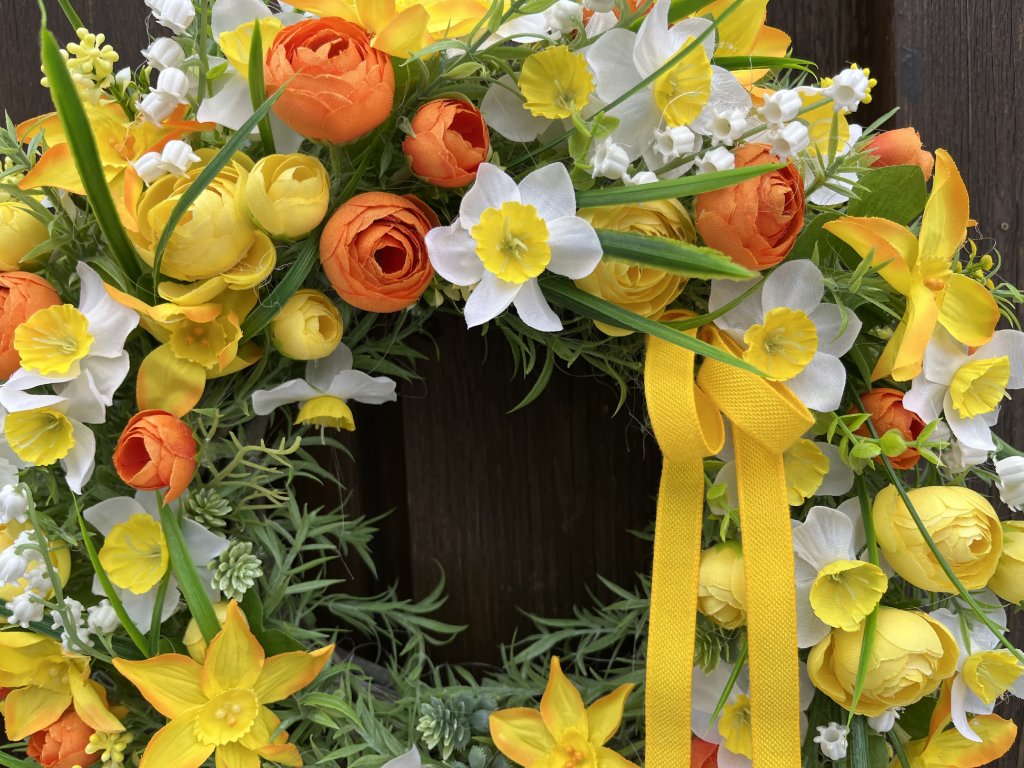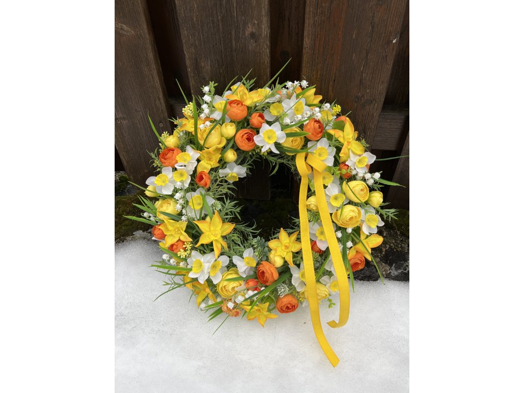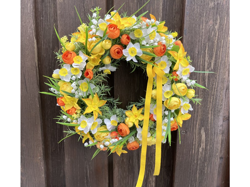 - Tento jarní věnec je bohatě zdobený pestrou zelení, eukalyptem a květinami, jako jsou bílé a žluté narcisky, žluté a oranžové pryskyřníky, jemné konvalinky a žlutá stuha.