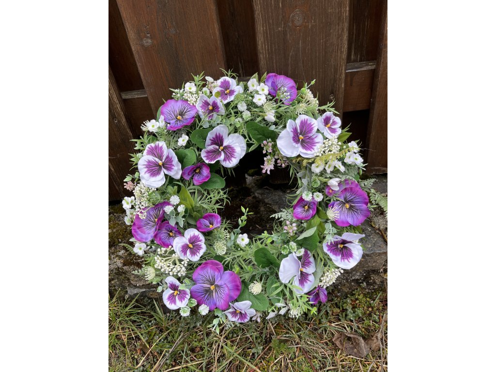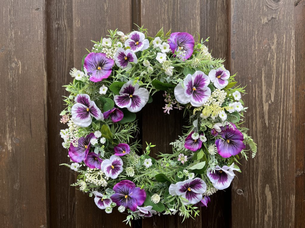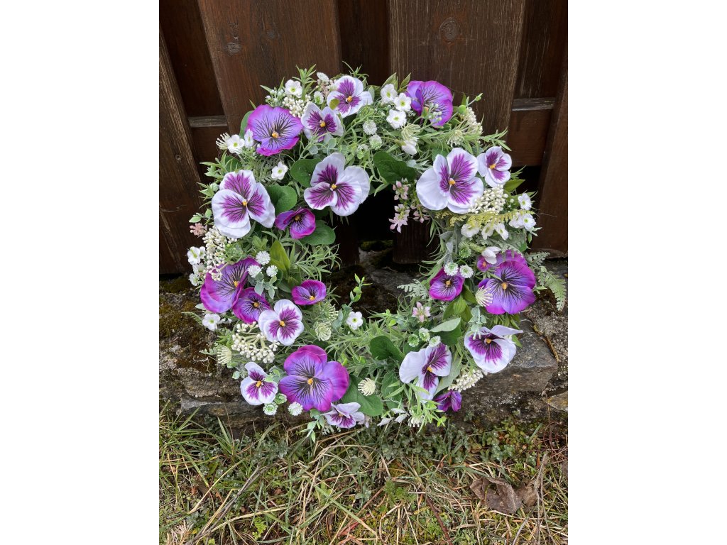 Věnec je zdobený bohatou zelení, kapradím a eukalyptem, které vytvářejí svěží přírodní základ. Hlavní ozdobou jsou umělé macešky ve fialové a bílo-fialové barvě, které věnci dodávají výrazný jarní charakter. Celou kompozici doplňují drobné květy, které dekoraci zjemňují a dodávají jí lehkost.