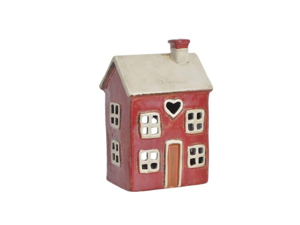 Keramický domek na čajovou svíčku – červený se srdíčkem (18,5 × 12 × 8,5 cm)