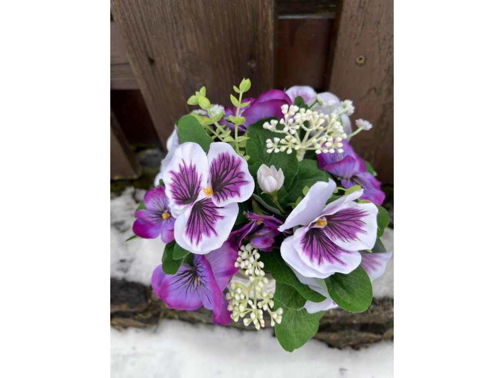 Fialové a bílo-fialové macešky vypadají jako živé. Jsou doplněné o zeleň a drobné bílé květy.