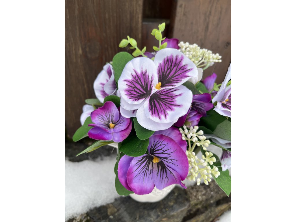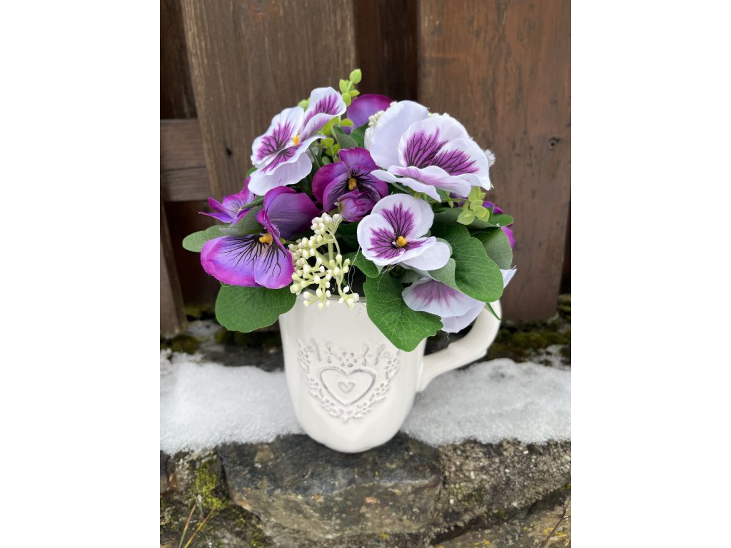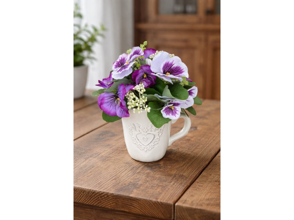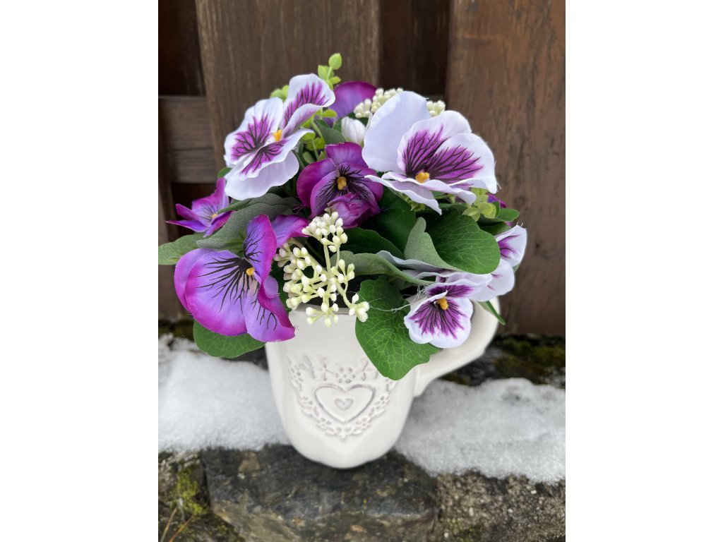 Umělé macešky jako živé jsou ručně aranžované do bílého keramického džbánku s designem srdíčka.