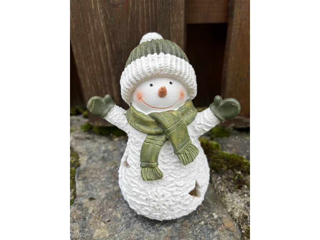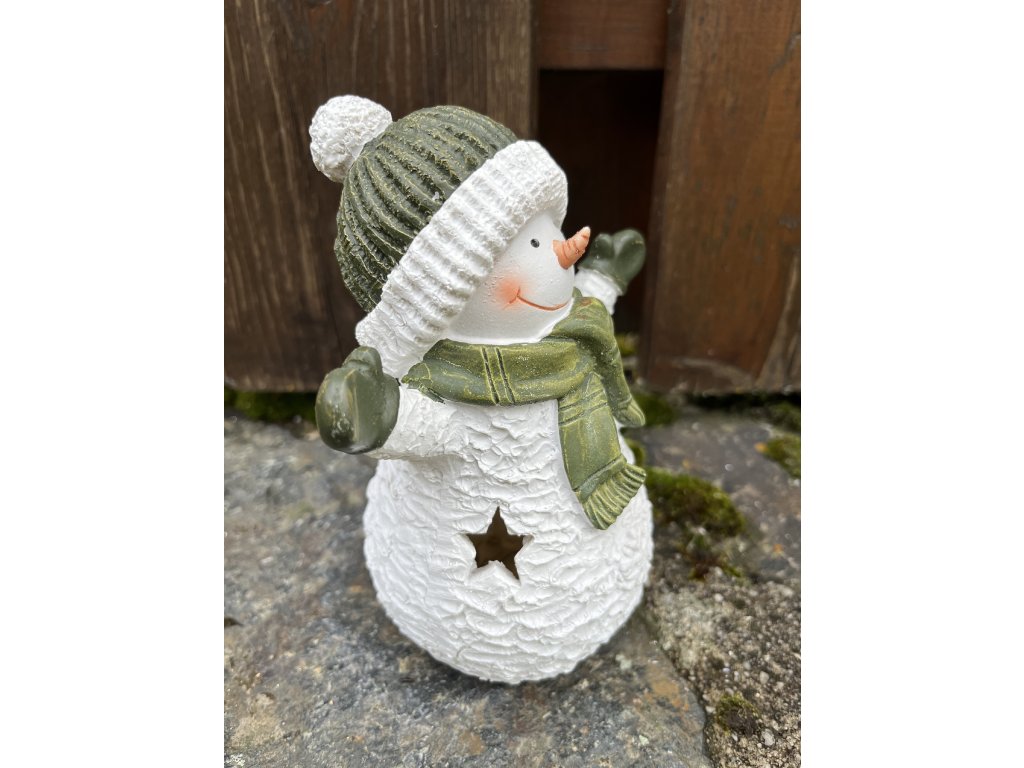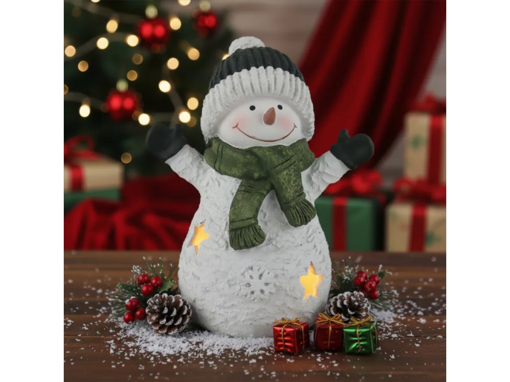 Vneste do svého domova radost a kouzlo zimních svátků s touto krásnou LED vánoční dekorací ve tvaru sněhuláka. Tento milý sněhulák s přátelským úsměvem je vyroben z kvalitního polyresinu a ozdoben zelenými detaily, které mu dodávají svěží vánoční vzhled. Jemné LED osvětlení, které je ukryto uvnitř dekorace, vytváří příjemné teplé světlo a navozuje klidnou, slavnostní atmosféru.