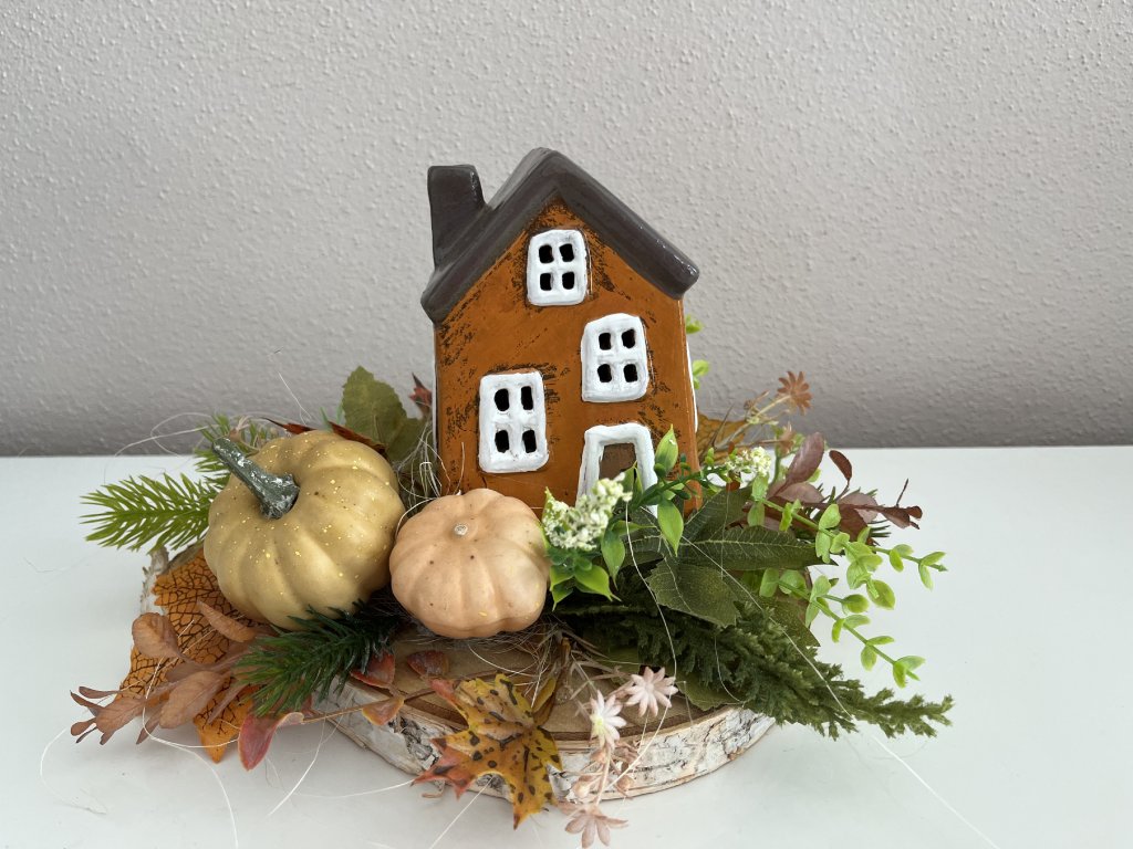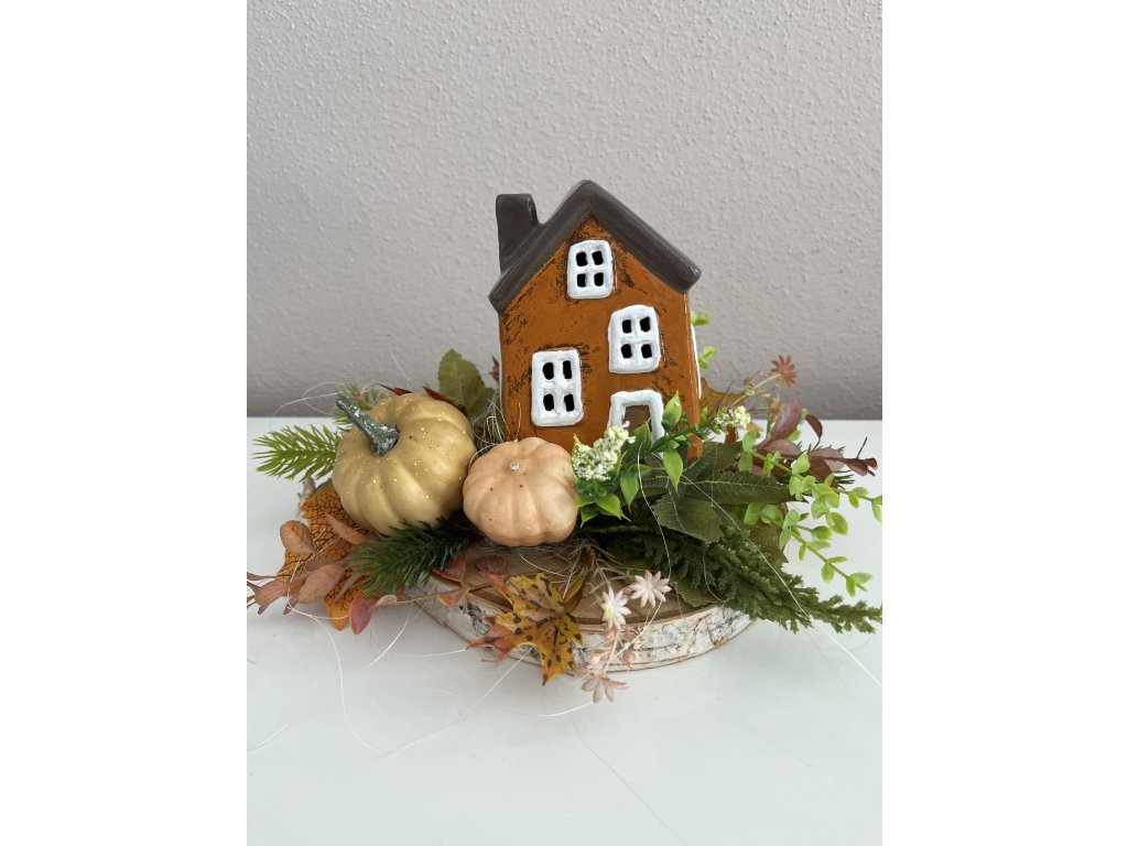 Originální podzimní dekorace do bytu na dřevěné kulatině vnese do vašeho interiéru kouzlo teplých podzimních barev. Základem je pevná kulatina ozdobená zelení, umělým chvojím, barevnými podzimními listy, drobnými květy, přírodním sisalem a malými dýněmi. Dominantou celé kompozice je stylový keramický domeček s LED osvětlením, který vnáší do prostoru jemné a útulné světlo.