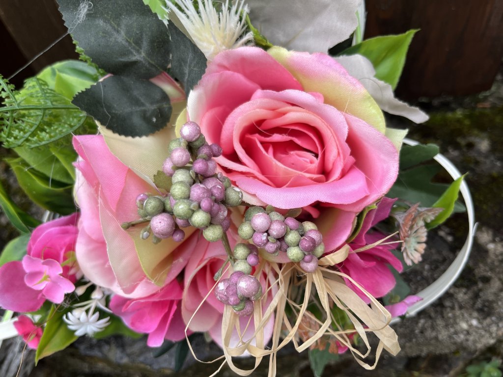 Materiály: Proutí, textilní růže, bobule, ratan, umělá zeleň, lýko