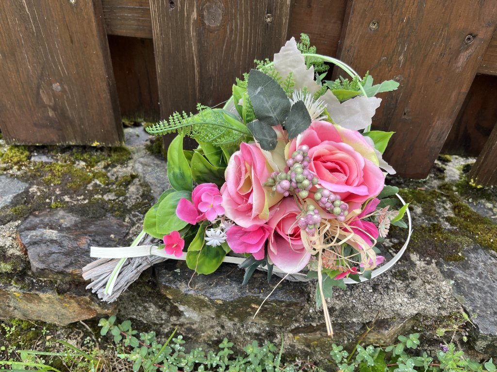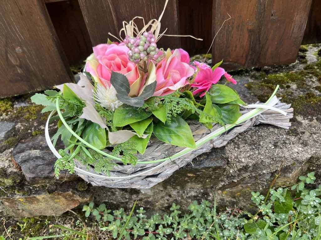 Popis: Proutěné srdce na hrob s látkovými růžovými růžemi