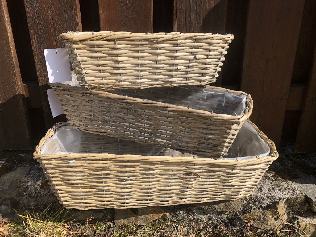 Sada třech kusů proutěných truhlíků je vhodná k osázení živými i umělými rostlinami. V každém truhlíku je igelit. Brání protečení vody při zalévání.