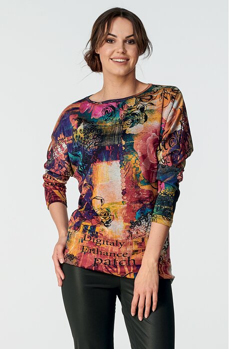Delší volnější dámská halenka s kulatým výstřihem a 3/4 rukávy. Zadní díl halenky je z kontrastní látky a je střižen do kulata.