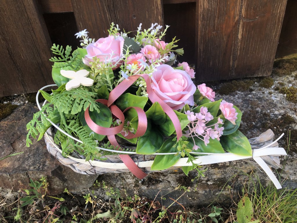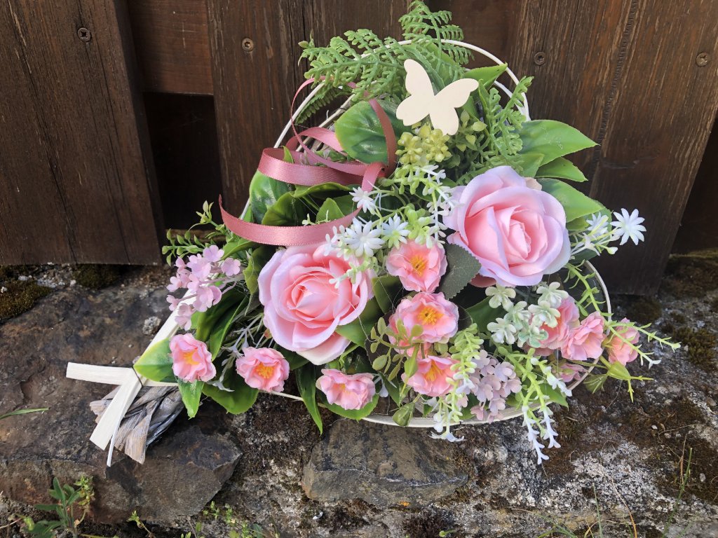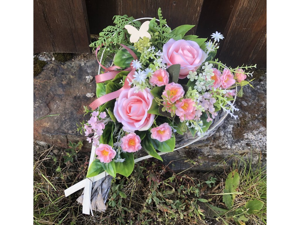 Elegantní a pečlivě zpracovaná dekorace na hrob ve tvaru proutěného srdce je symbolem lásky, vzpomínek a tichého rozloučení. Srdce je bohatě zdobeno růžovými růžemi, bílými květy, kapradím, zelení, růžovou stuhou a po obvodu doplněno bílým ratanem. Nechybí ani jemný dřevěný motýlek, který podtrhuje pietní a přírodní charakter dekorace.