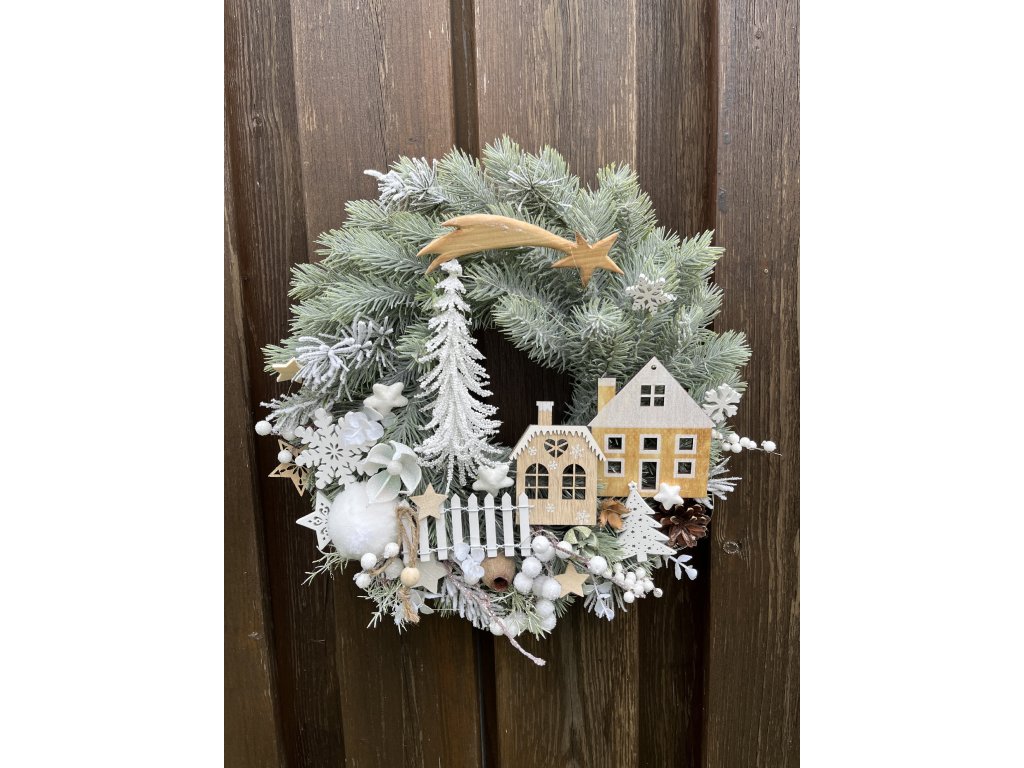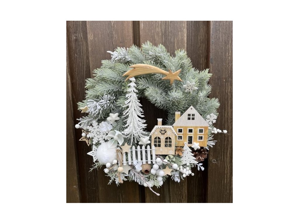 Výjimečným prvkem věnce je velká sněhová koule, bílý vánoční stromeček a dekorativní dřevěné domečky, které dodávají celé kompozici pohádkový charakter. Středem celé výzdoby je pak ručně vyřezávaná dřevěná kometa – symbol štěstí, naděje a tradice, který přináší do každého domova pocit klidu a radosti.