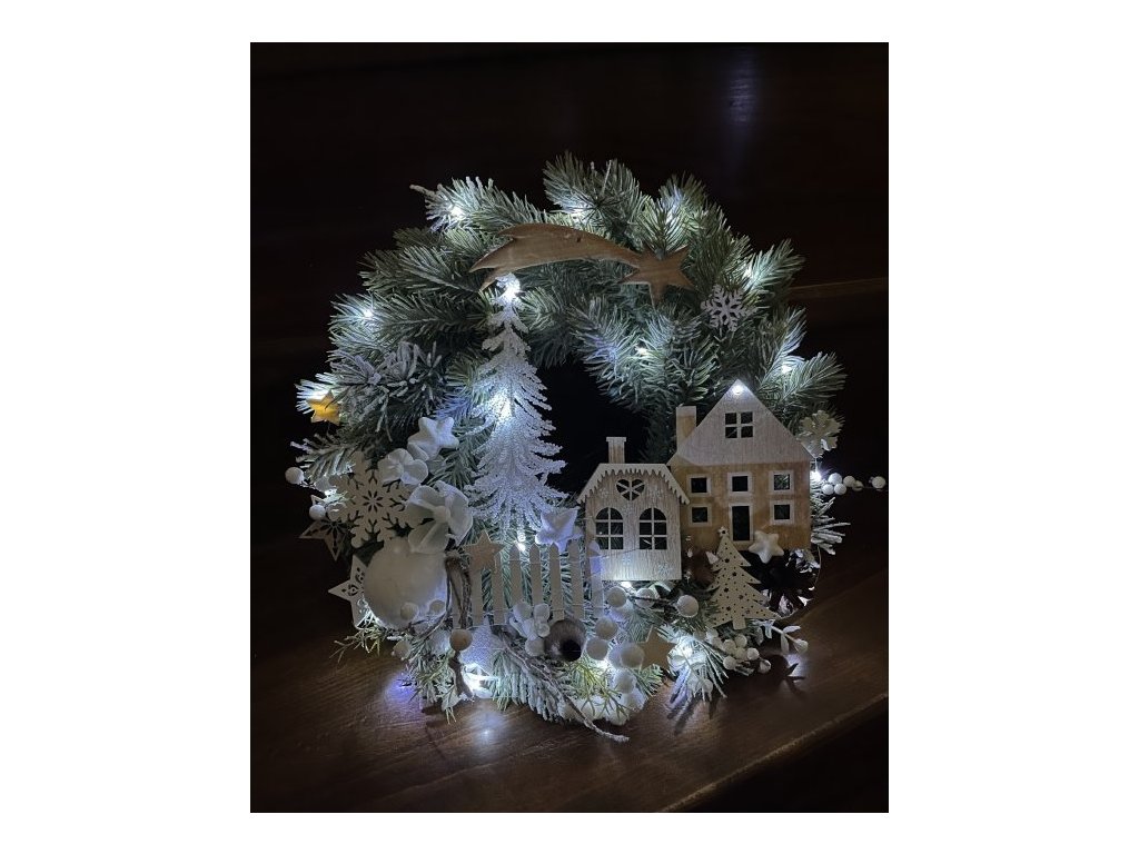 Tento jedinečný svítící vánoční věnec vnese do vašeho domova kouzlo Vánoc hned při prvním pohledu. S průměrem 38 cm se stane dominantní ozdobou vchodových dveří, krbu či stěny, kde okamžitě přitáhne pozornost. Je bohatě zdoben dřevěnými domečky, stromečky, velkou sněhovou koulí, hvězdičkami, přírodními plody, šiškami a bobulemi, které vytvářejí hřejivou a autentickou zimní atmosféru.