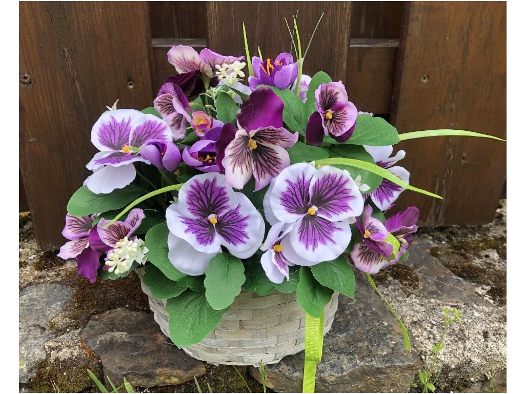 Kytice těchto umělých macešek v bílo-fialové barvě má 10 rozkvetlých květů a poupata, listy.