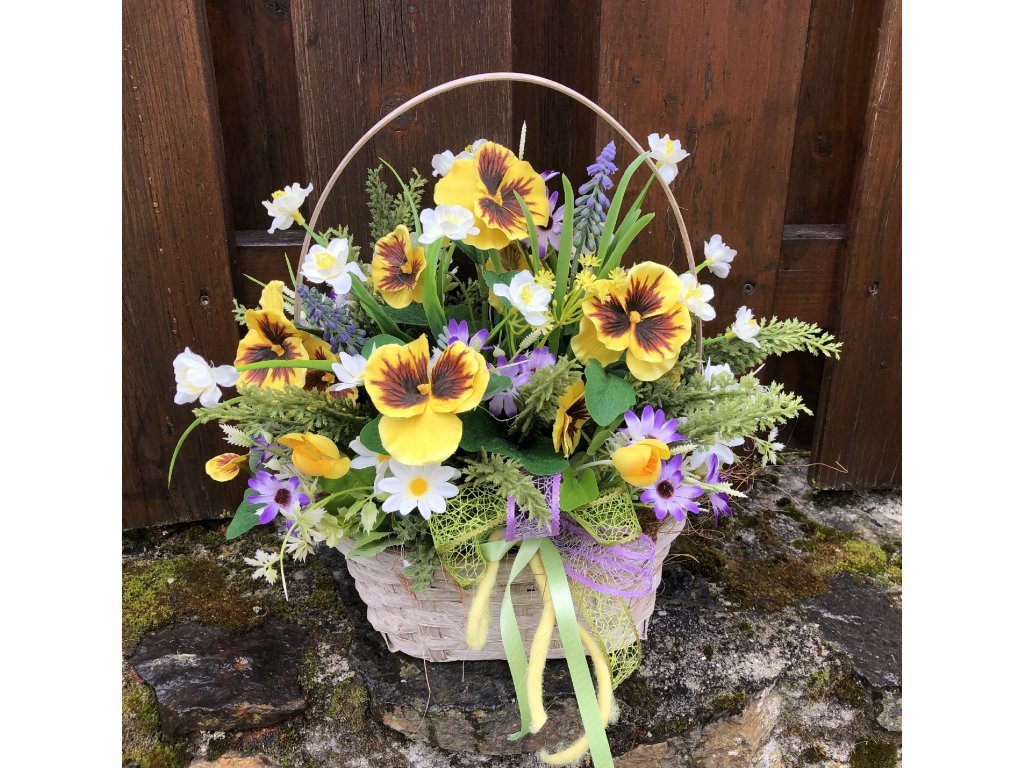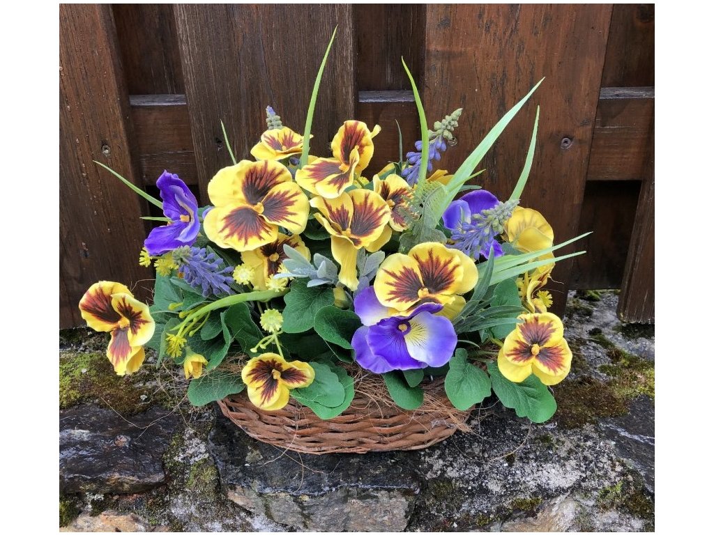 Krásné žluté macešky s hnědým středem jsou každoročně nejvíce žádané. Tyto umělé macešky můžete nakombinovat se žlutými nebo fialovými maceškami, modřencem.