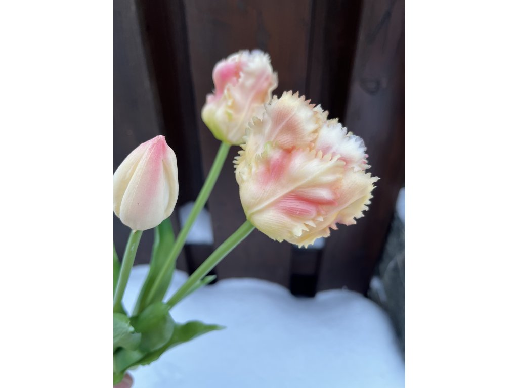 Umělé tulipány silikonové meruňkové 40 cm jsou jemnou a velmi realistickou dekorací, která vnese do interiéru teplý a elegantní barevný akcent. Tento svazek tří umělých tulipánů je vyroben ze měkkého plastu silikonu, díky kterému květy i stonky působí přirozeně a na dotek připomínají živé květiny.