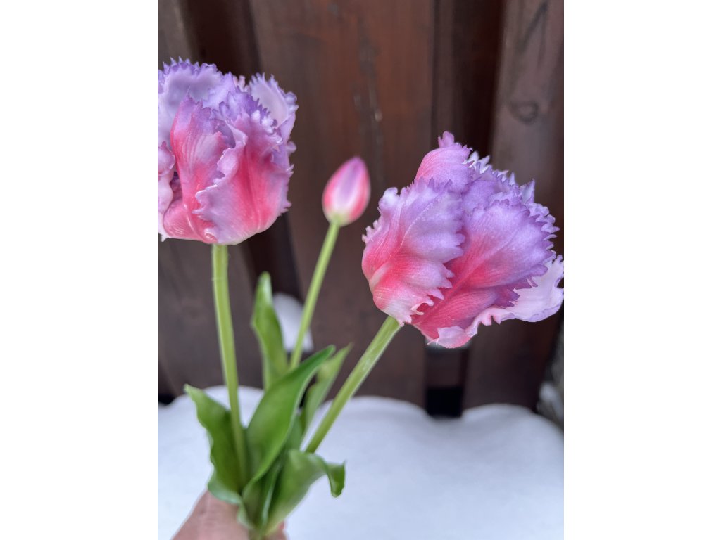 Umělé tulipány jako živé fialové 40 cm jsou elegantní a velmi realistickou dekorací, která vnese do interiéru výrazný, ale zároveň jemný barevný akcent. Tento svazek tří řezaných tulipánů v krásných odstínech fialové barvy je vyroben z měkkého plastu, který věrně napodobuje přirozenou strukturu květů i listů.