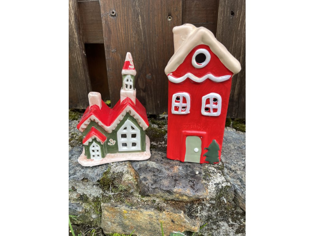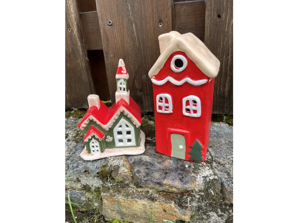 Červený keramický domeček s béžovou střechou působí útulně a domácky – jeho vchod zdobí malý vánoční stromeček, který dodává dekoraci kouzelný detail. Vedle něj se dokonale vyjímá kostel v zelené barvě s červenou střechou a bílými okny – dohromady tvoří harmonický celek, který skvěle zapadne do vánoční vesničky nebo jako samostatná dekorace na stůl či parapet.