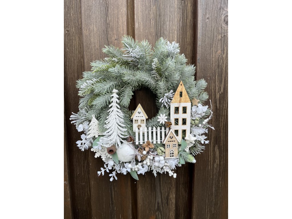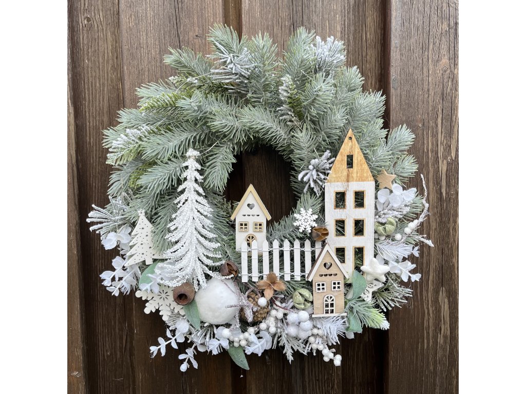 Vytvořte si doma kouzelnou sváteční atmosféru s tímto vánočním věncem s LED dekorací, který se stane elegantní ozdobou vašich dveří či stěny. Bohatě zdobený dřevěnými domečky, bílými stromečky, suchými plody, bobulemi, dřevěnými vločkami a bílým eukalyptem, přináší do interiéru jemnou zimní harmonii a přírodní půvab.